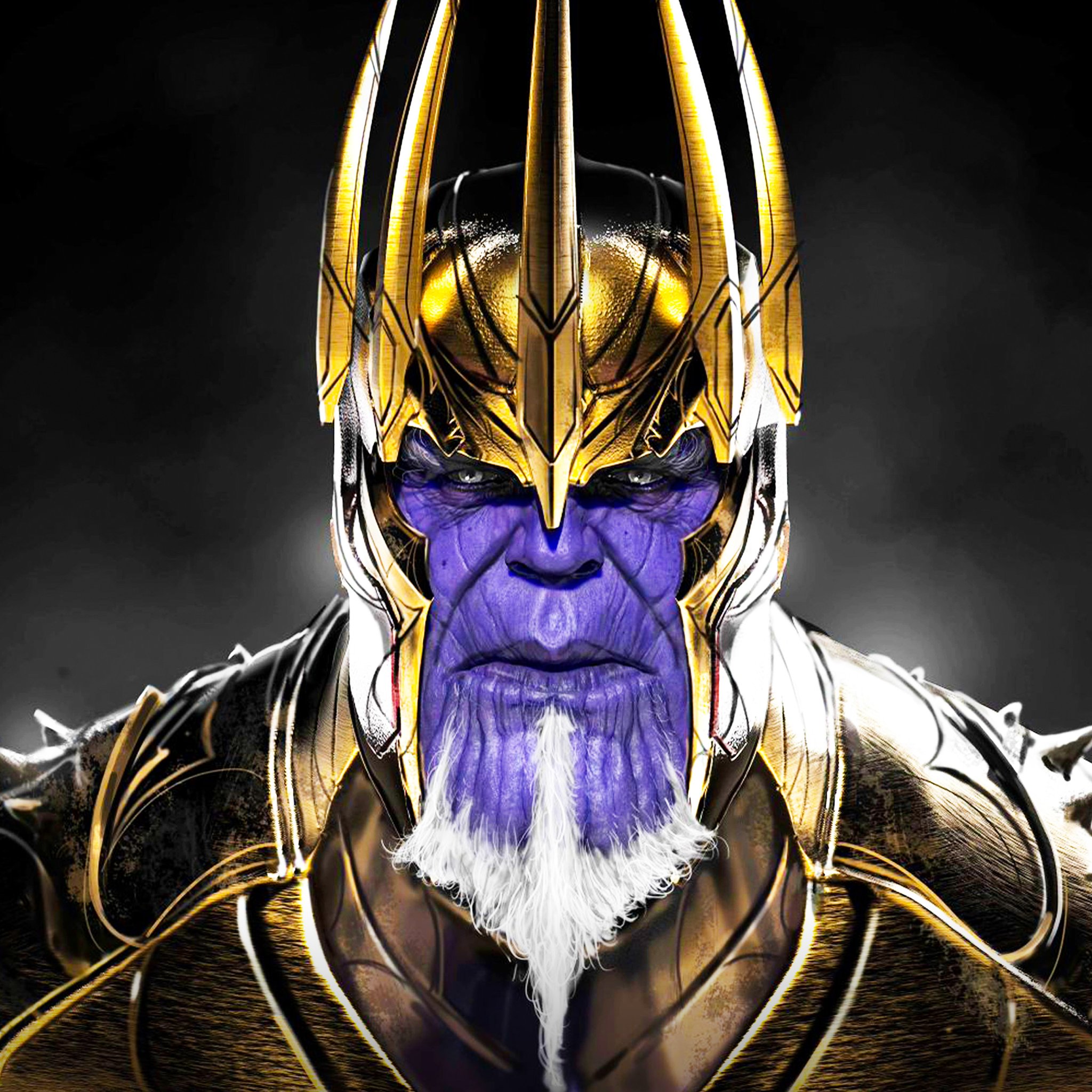 Rappelons que dans AVENGERS CAMPUS, on se trouve dans une autre version de l'univers Marvel, différente de celle du MCU, dans laquelle Tony Stark est toujours en vie. D'où l'idée de combattre le "Roi Thanos", autre version encore invaincue du tyran fou. Le portrait du Roi Thanos :