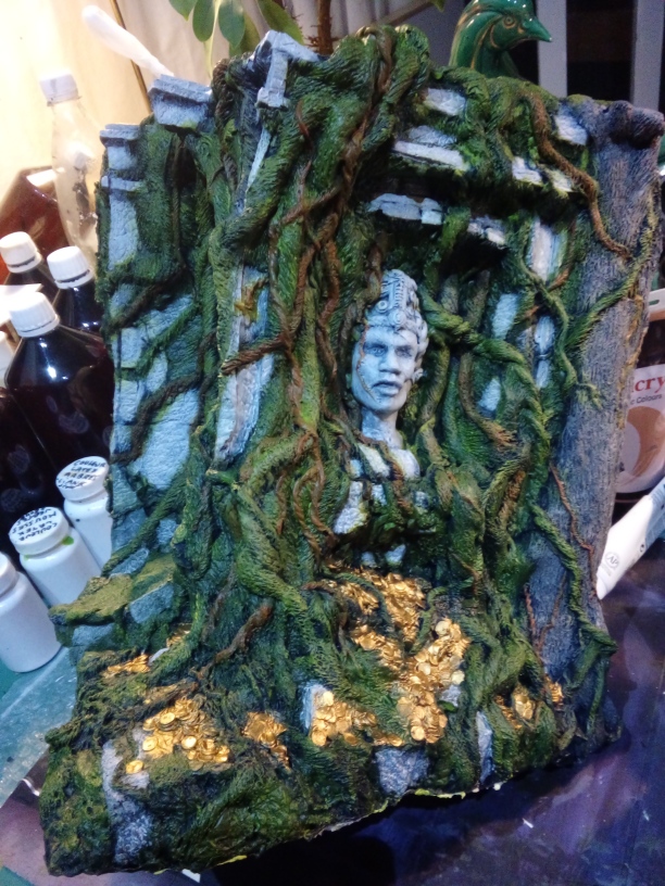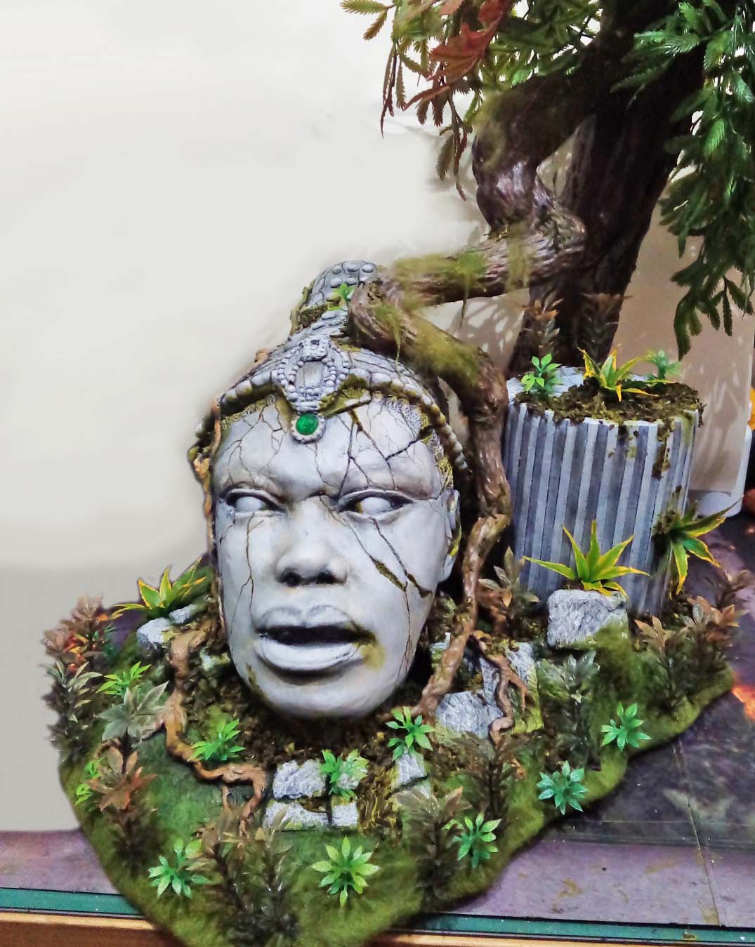Les finitions du module 1 du diorama : les branches trop brillantes et le tronc ont été passées au vernis mat pour obtenir un rendu satiné qui souligne bien les volumes et les textures tout en créant un rendu différent des pierres au sol et de la tête de la statue qui sont complètement mates.