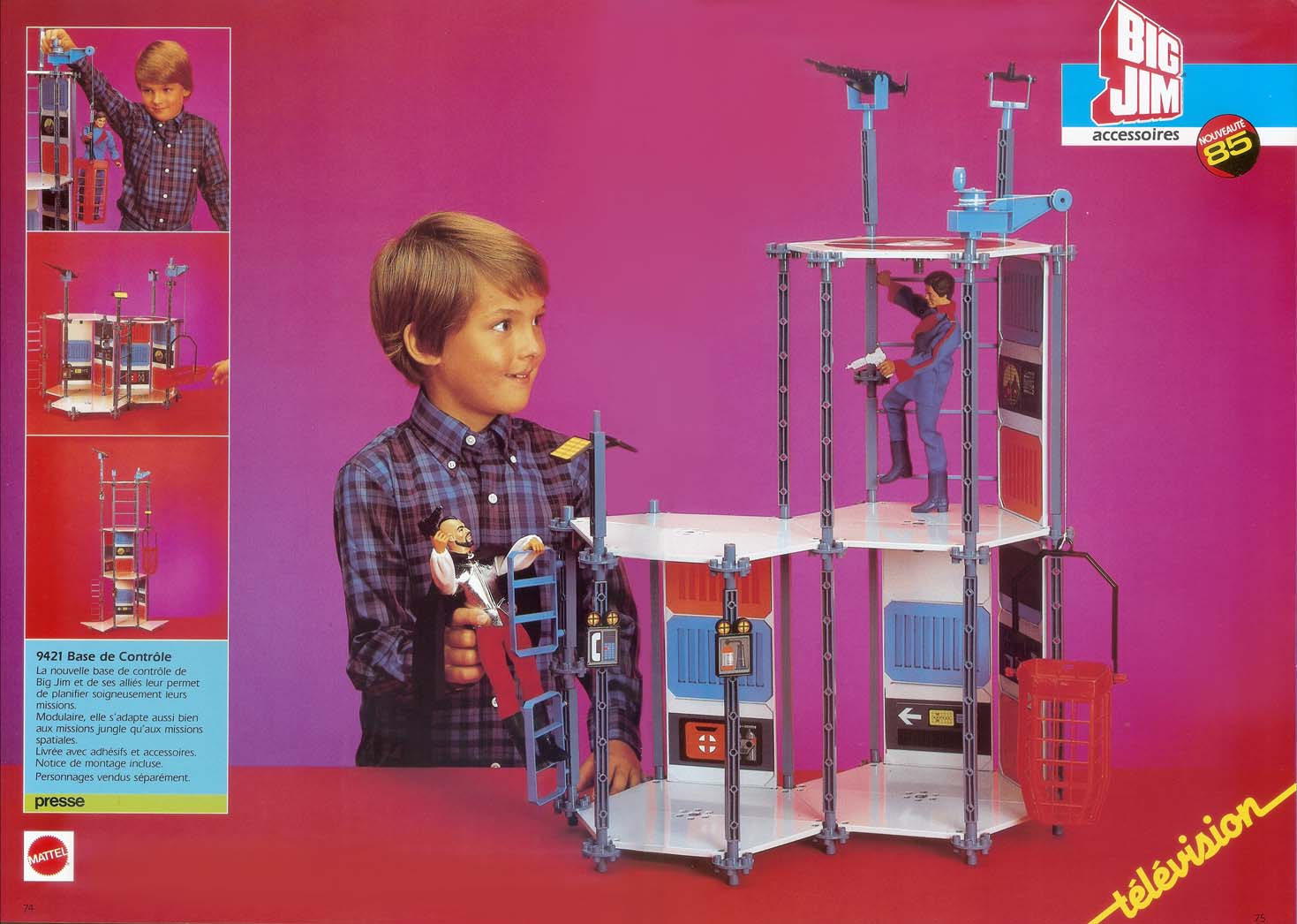 Retour à la gamme Espace /Espionnage de 1985, avec cette double page du catalogue Mattel France (j'ai effacé la pliure au milieu) et un petit garçon qui a vraiment l'air fou de joie en regardant la base spatiale de Big Jim et de ses amis !