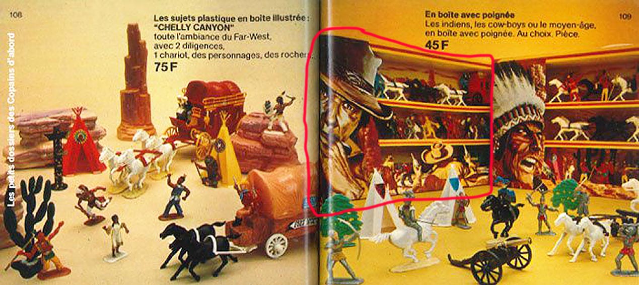 Un de mes amis recherche le coffret de figurines Western qui est représenté sur cette photo, avec le visage de Charles Bronson reproduit sur l'illustration. Il s'agit du catalogue jouet des nouvelles galeries de 1974.