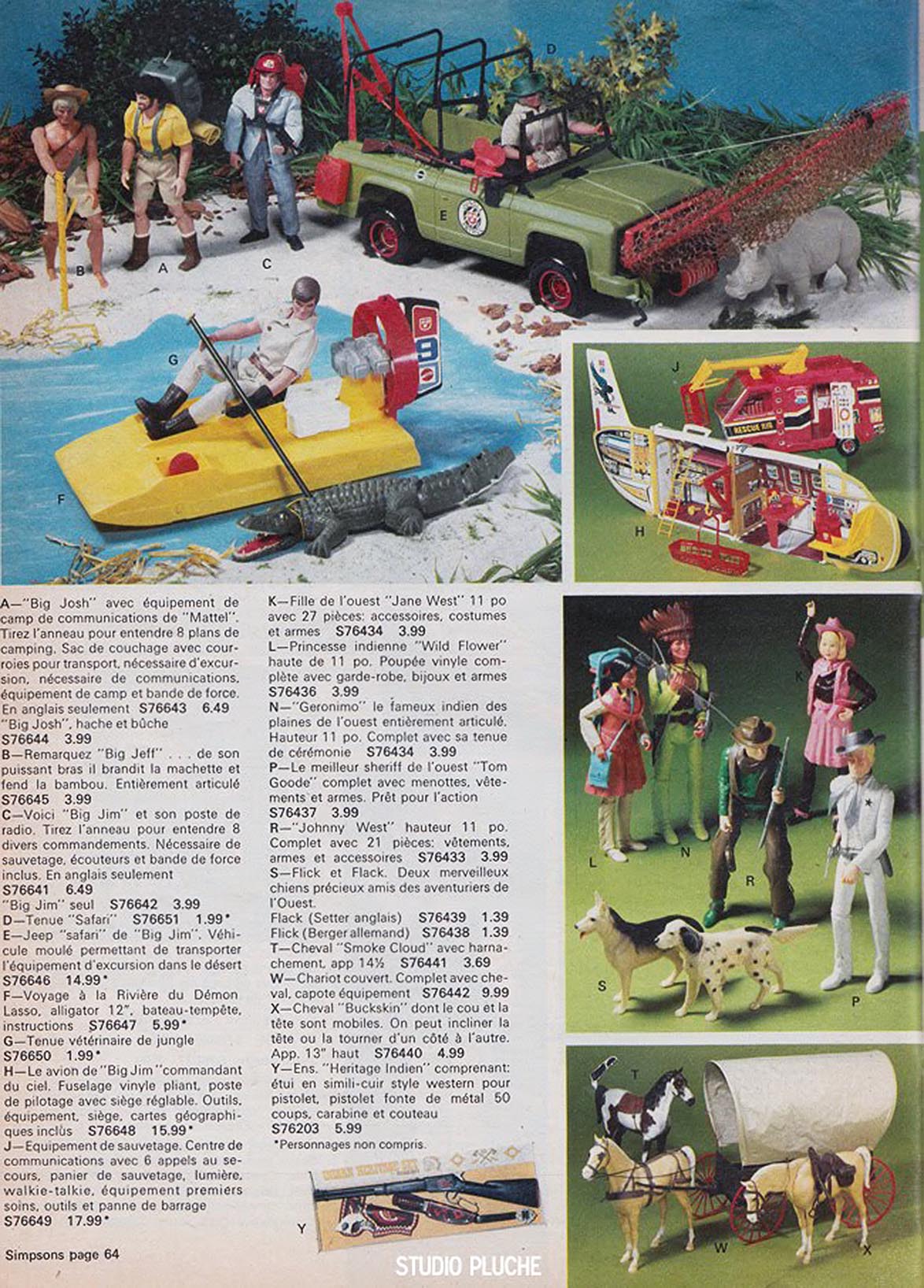 Voici un visuel vintage bien sympa trouvé sur le blog de nos cousins d'outre-Atlantique "Studio Pluche" : il s'agit d'une page consacrée à Big jim dans un catalogue de vente par correspondance canadien de 1974 dont le nom va forcément vous faire penser à une célèbre famille, puisqu'il s'appelle "Simpsons" !