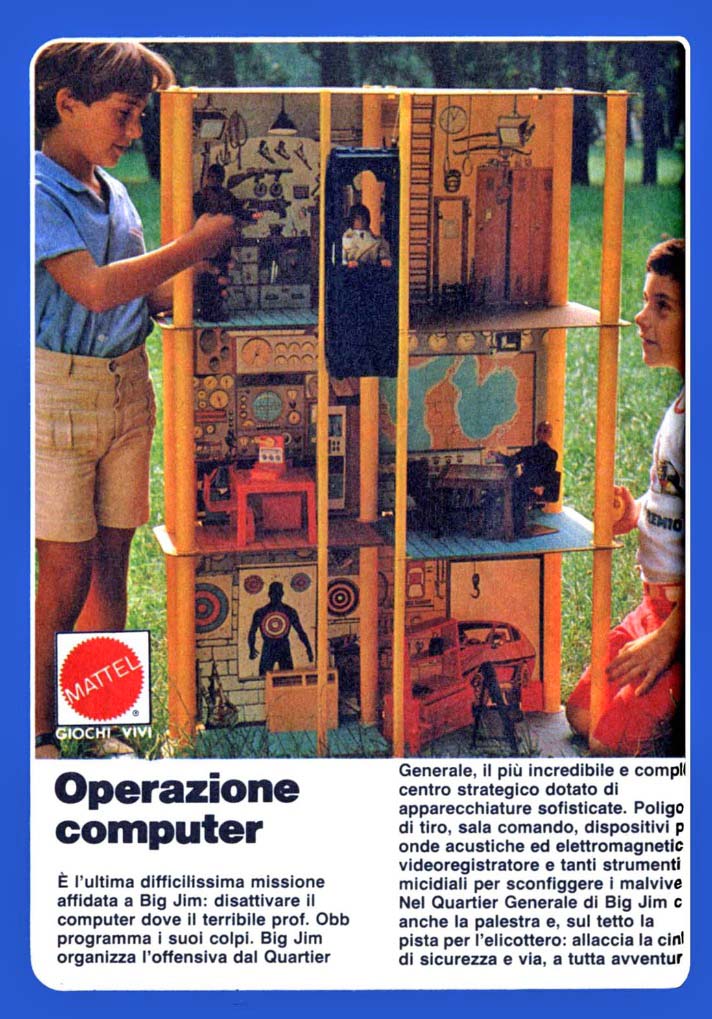 Comme j'ai le plaisir de le montrer dans mon livre sur Big Jim, les italiens ont souvent traité les illustrations publicitaires avec un beau sens de la scénographie, et un vrai soin artistique apporté aux petits décors entourant les personnages et leurs accessoires. Idem pour la mise en scène des enfants s'amusant avec ces personnages cultes, comme on peut le voir dans l'image ci-dessous, avec la base des espions de la gamme Big Jim 004. Comme souvent dans les maisons, véhicules et bateaux de l'univers de Big Jim, tout le design de base et la structure technique du jouet avaient d'abord été mis au point pour Barbie, puis redécorés en version masculine !