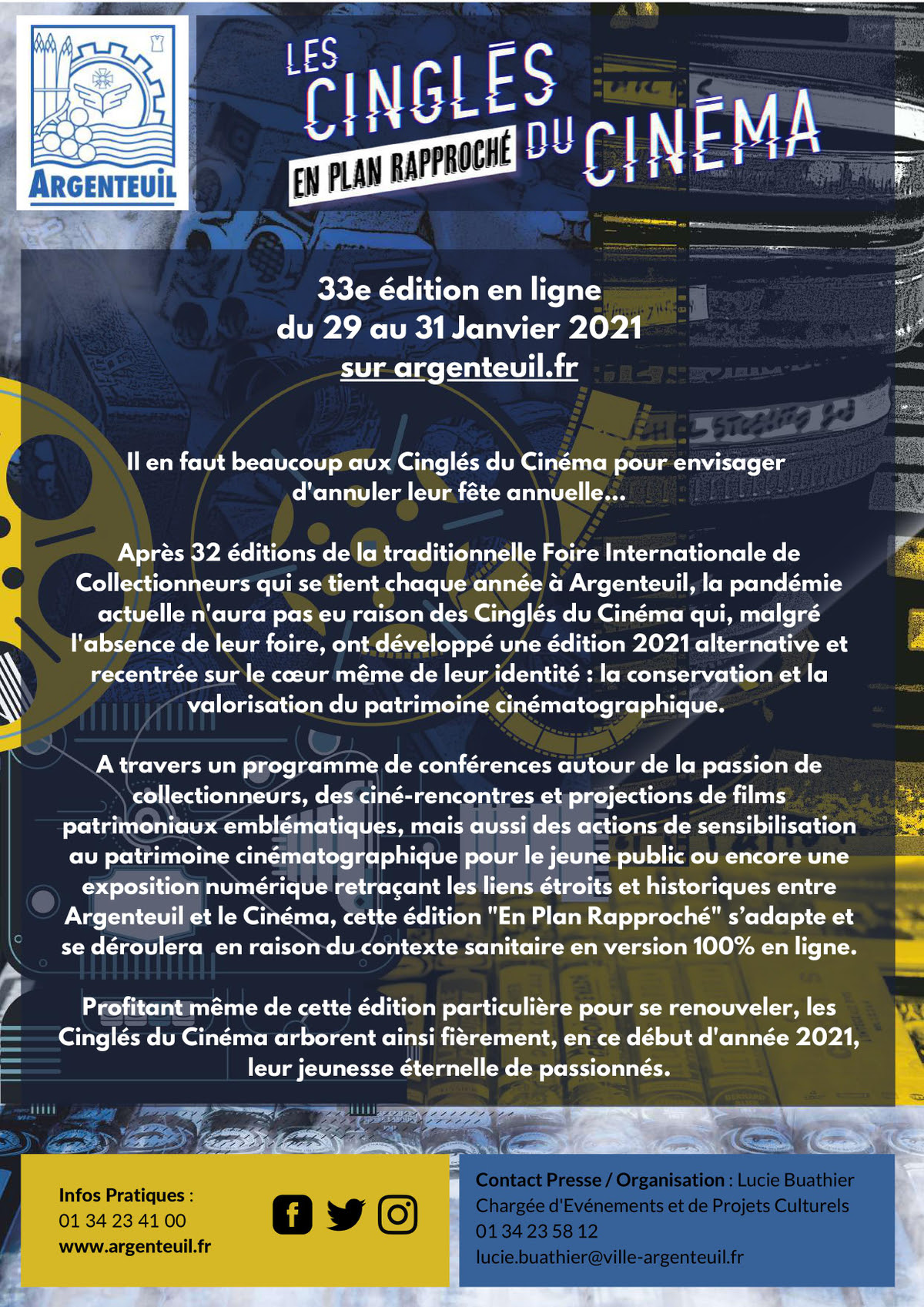 Voici l’affiche de cette édition alternative comprenant un programme de conférences autour de la passion de collectionneurs, des ciné-rencontres et projections autour de pépites du patrimoine cinématographique mais aussi des actions de sensibilisation pour le jeune public ou encore une exposition numérique « Argenteuil, Ville de Cinéma ».