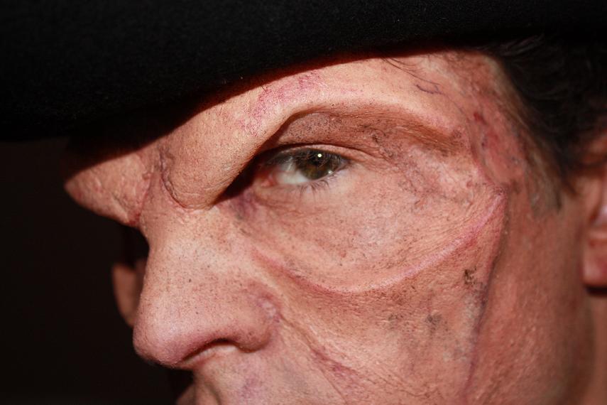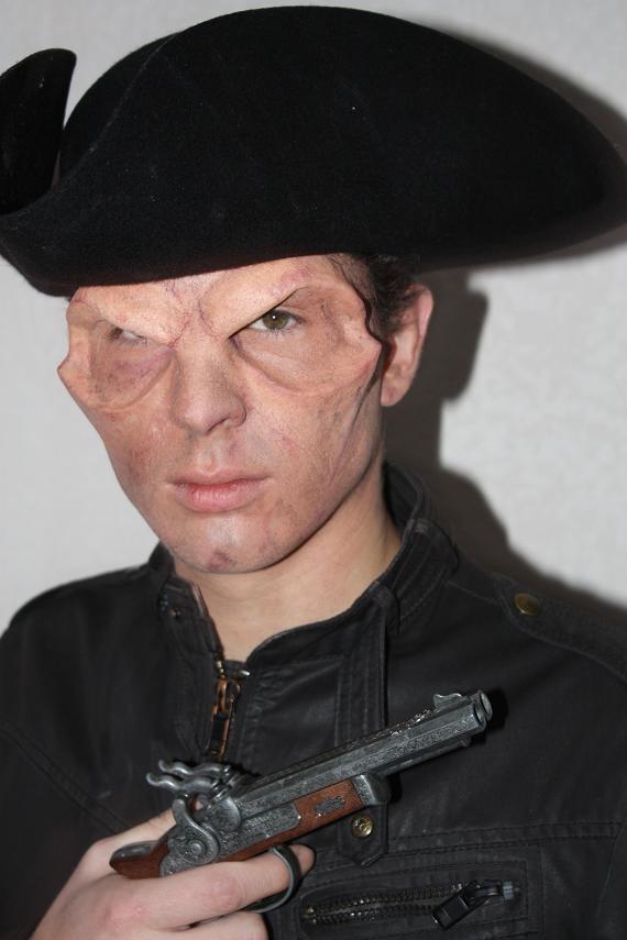 A la base, la prothèse devait servir pour un tournage qui a été repoussé (alors que j'avais eu très très peu de temps pour la réaliser... bref!!). Du coup la prothèse n'est pas du sur mesure. Elle a été tirée en mousse P.U.