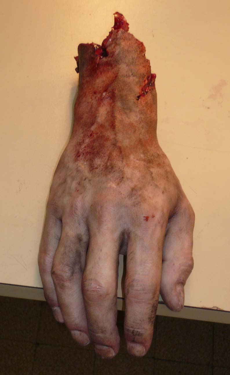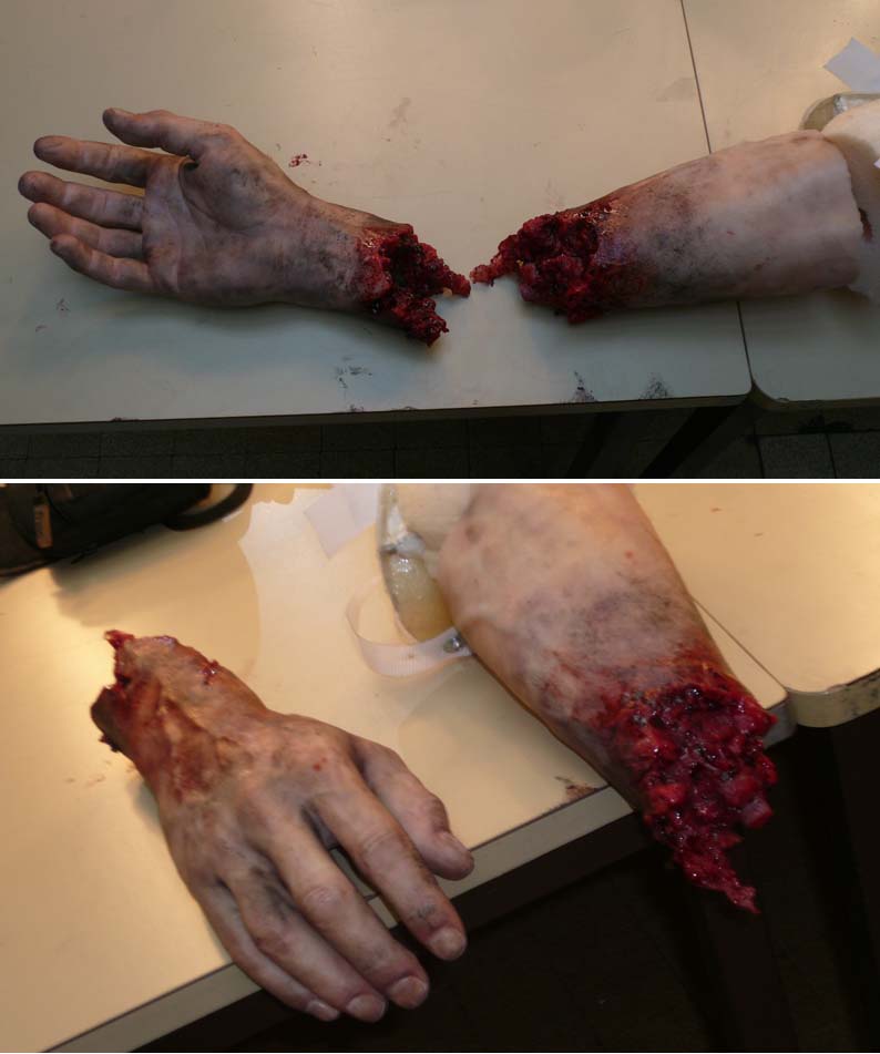 Je peins vite fait la main et le bras (ils seront noircit par l'explosion et plein de sang) J'utilise des peintures acryliques passés à l'aéro et au pinceau, fixés dans des voiles de silicone en tube (Wacker, offrant une très bonne accroche) dilués dans de l'essence à briquet, et passés au pistolet. Ensuite "j'ampute" mon bras en silicone en découpant directement dedans. Pour habiller les blessures efficacement et rapidement, je prépare des mélanges de silicone transparent, teintés avec du faux sang et des pigments, de différentes viscosités (épais ou plus liquide) et très accélérés, et je travaille directement dans les plaies, en plusieurs couches jusqu'à obtenir un effet réaliste et permanent. Un peu de sang et de salissures sur le plateau et voilà. Un effet comme cela est fabriqué en une journée et demie, deux jours maximum, par une personne, et pour un coût raisonnable !