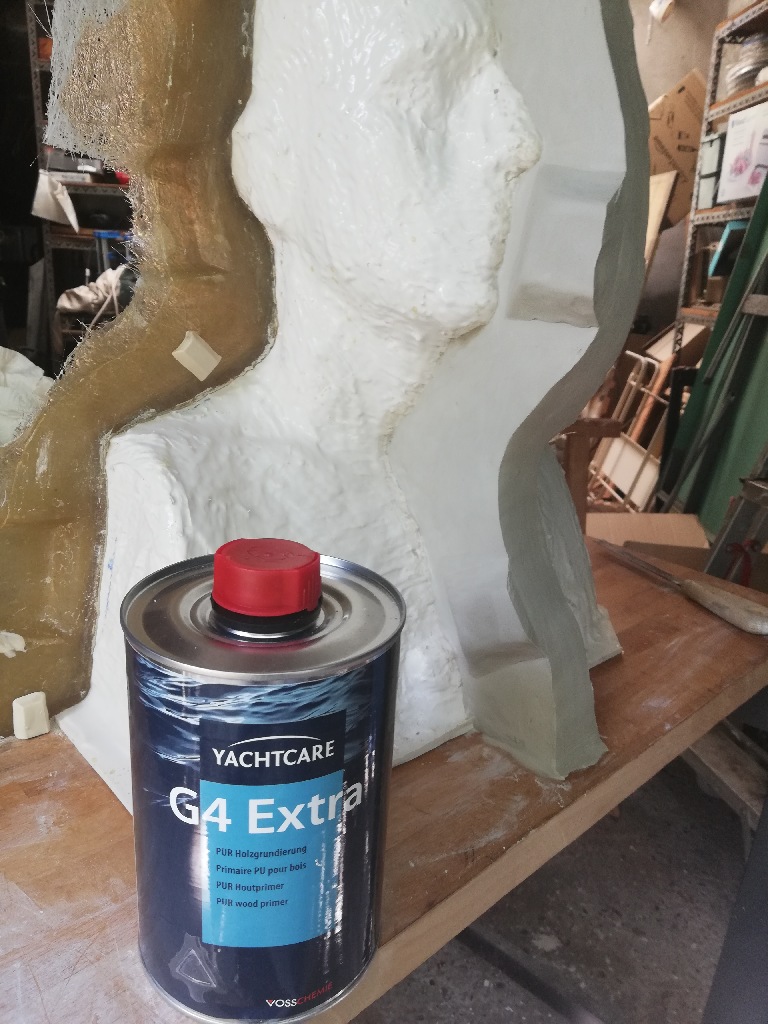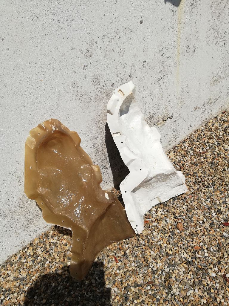 Pour rendre compatible la terre et la résine polyester, j'ai déposé 2 couches de G4 (résine monocomposant) sur toutes les faces du plan de joint (en plus cela durci la terre). Là, bonne surprise, comme je bosse, je n'ai pas toujours le temps d'aller travailler sur le modèle. Donc dans le garage où j'ai installé le modèle, la température en journée montait a 35°c ce qui est très chaud, mais j'ai pas trop le choix. Au bout d'une semaine, la terre était encore humide sous cette protection de G4.