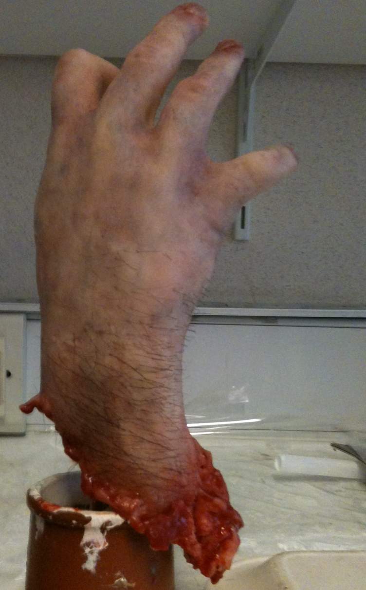 et voila mes essais de cadavre , j ai coulé du gel 10 dans un contre moule en body double qui trainait, le but étant de s exercer au mup silicone/cadavre et au poilage ( qui est en cours)...depuis, je louche !!