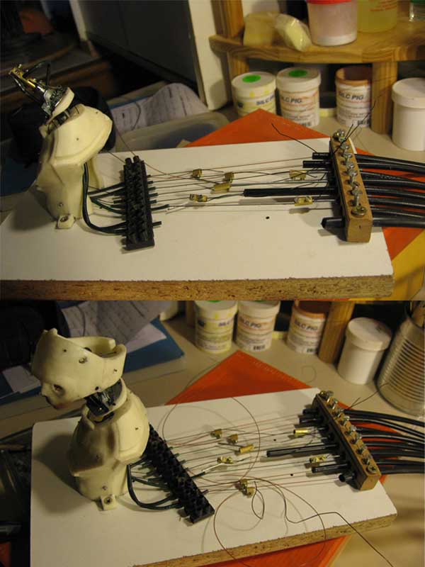 Entre la marionnette et le point de fixation des gaines, je relie les cables à vélos aux cables plus fins se trouvant dans la marionnette c'est ici que je fais les réglages. Ce montage est bien-sûr provisoire, à chaque fois je me rend compte de petits détails pour l'améliorer (ça donne un peu l'impression de réinventer la roue mais comment faire autrement...), une fois que tout sera au point, je pourrai plancher sur le montage définitif.