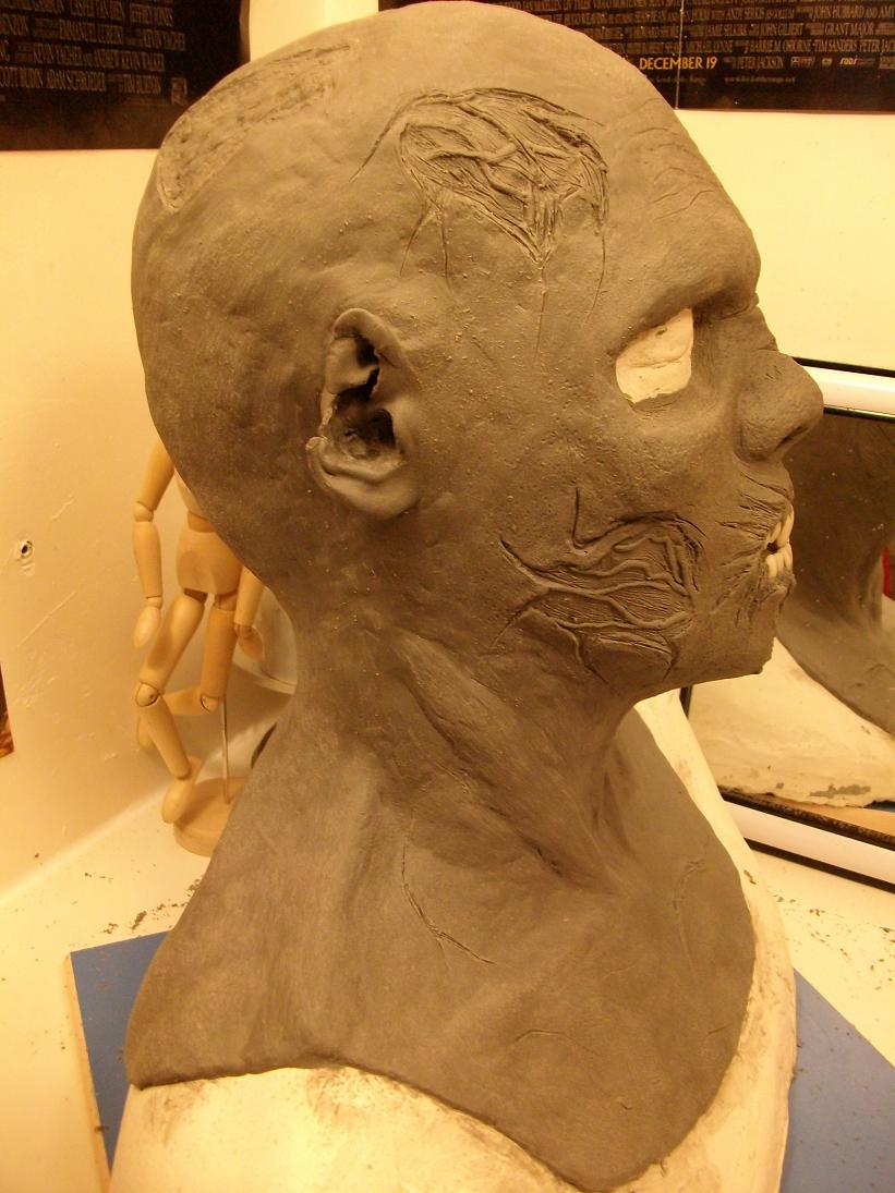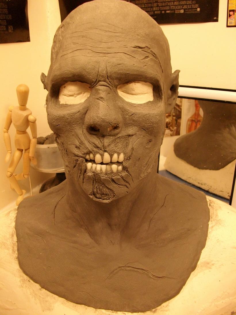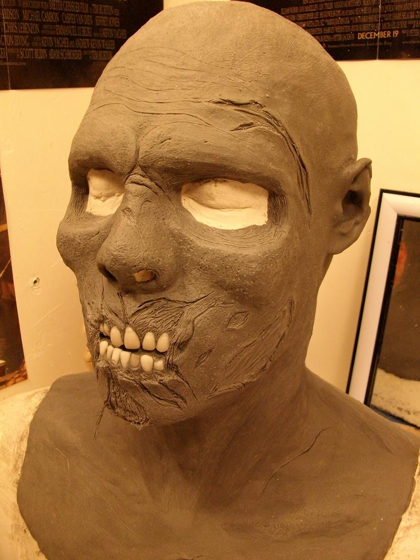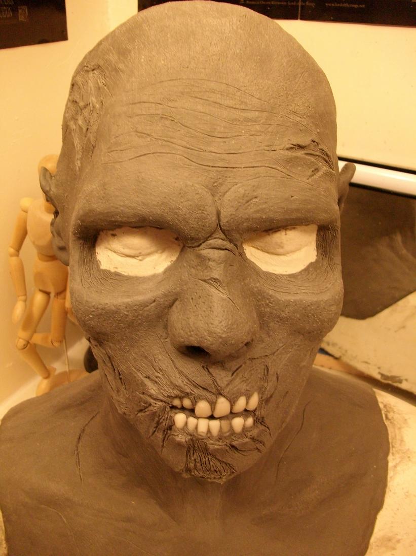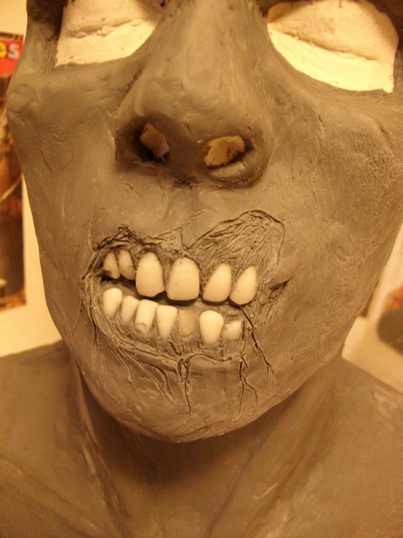 - la plaie de la bouche me dérange un peu car les dents semblent toujours posées sur la bouche fermée de quelqu'un. C'est à cause, je pense, de la forme de la plaie autour qui - si ça fonctionne mieux en bas - ne fonctionne pas trop en haut. Il n'y a pas assez de profondeur pour qu'on comprenne que la bouche a été arrachée.Il faudrait rajouter de la matière "peau éclatée" autour de la plaie (regarde la sculpture de la "bicyclette girl" de Walking Dead, l'idée est la même car il a fallu "tricher" l'effet de lèvres manquantes sur une bouche normale). Pour ça, tu pourrais rajouter du menton, en pensant à la forme de l'os en dessous.