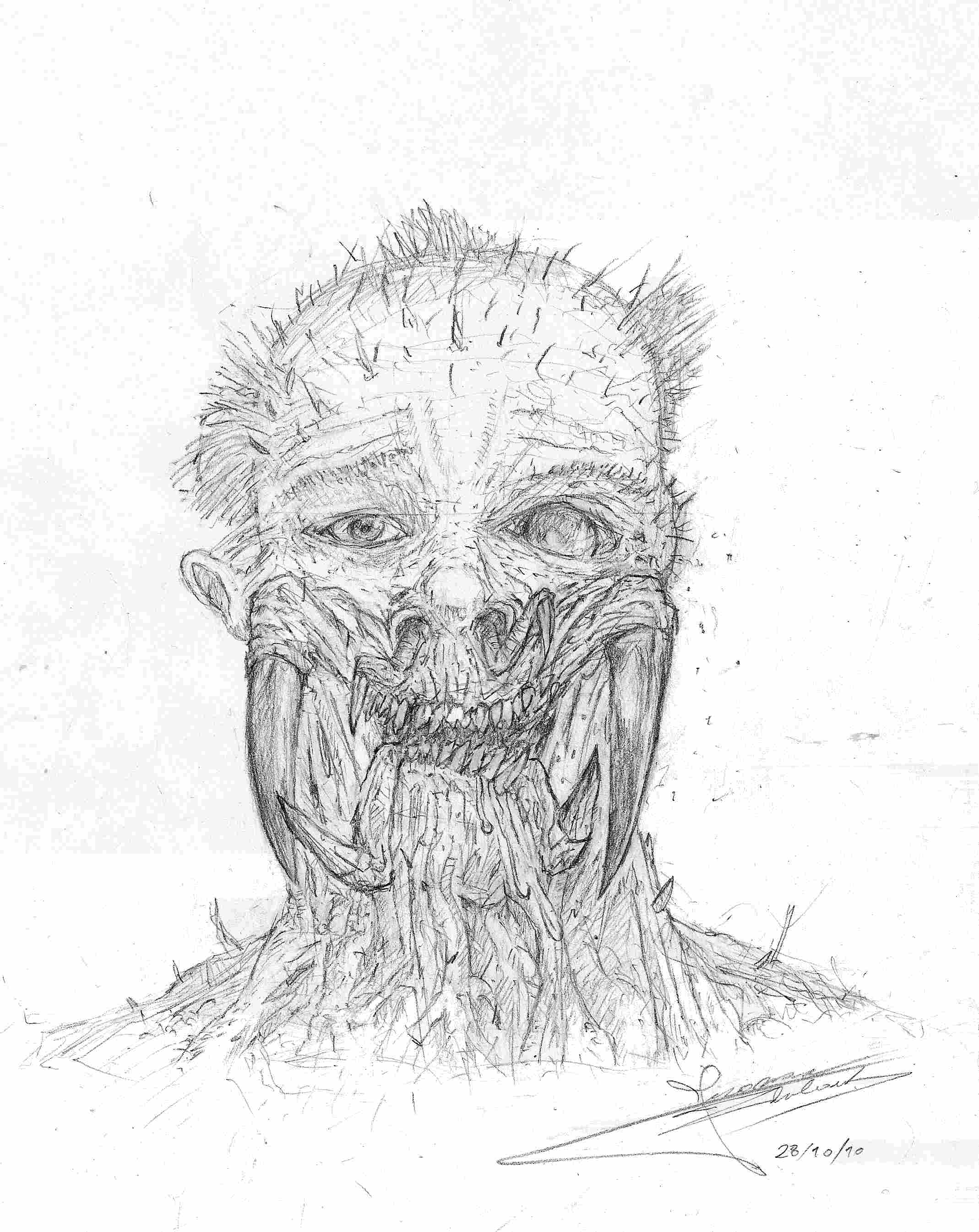 Pas mal du tout, l'effet de visage écorché ! :D Ton dessin est-il inspiré d'une transformation comme celle de "La mouche" ?
