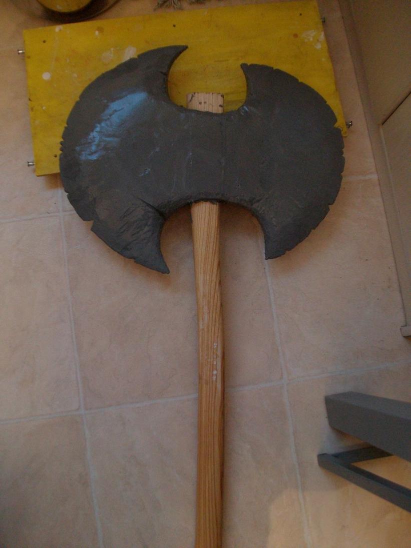 Seul truc auquel je songe seulement maintenant : si la double lame de la hache était vraiment en métal (et donc abominablement lourde), elle devrait être fixée sur un manche de bois beaucoup plus épais. Tel quel, on a l'impression que le manche est si fin qu'il va se casser au premier impact :wink: