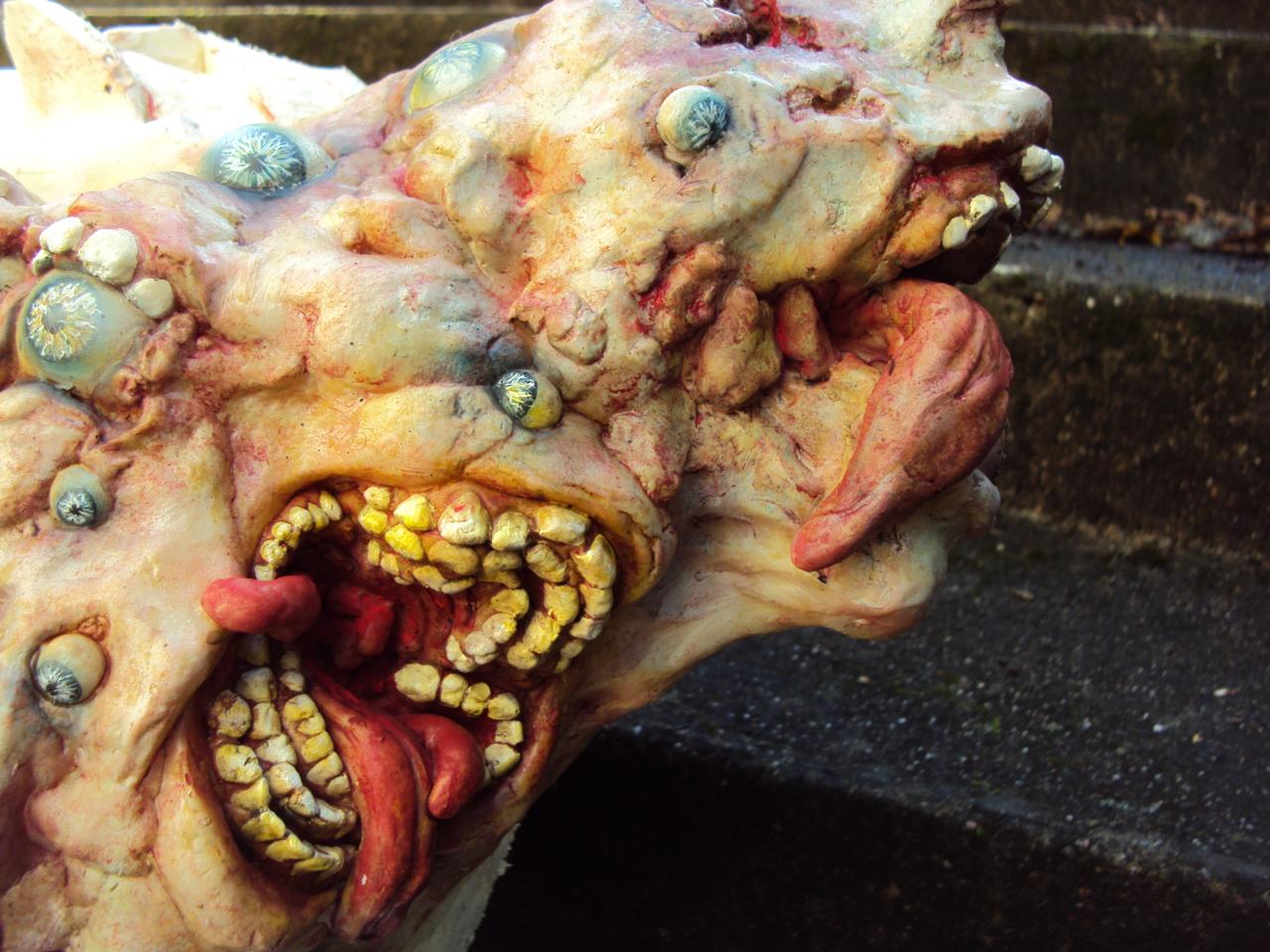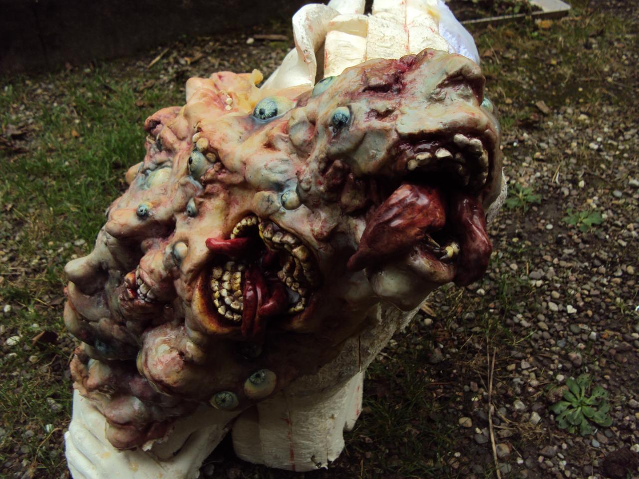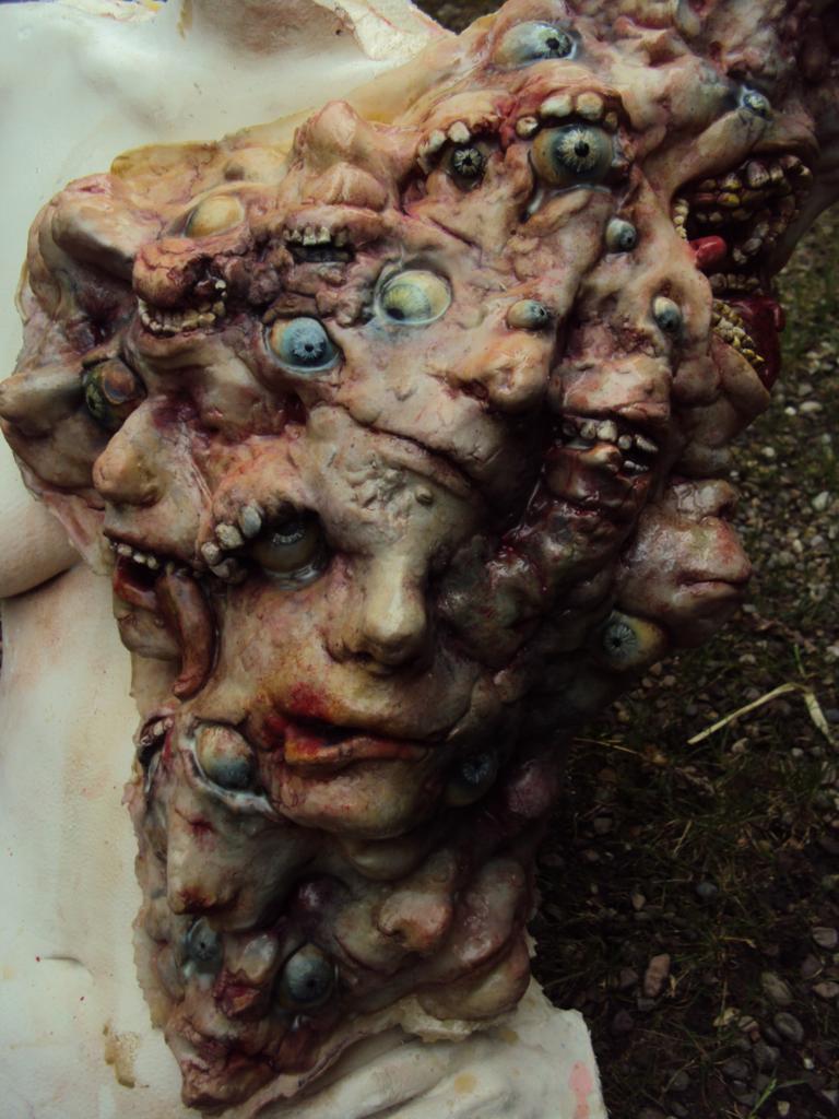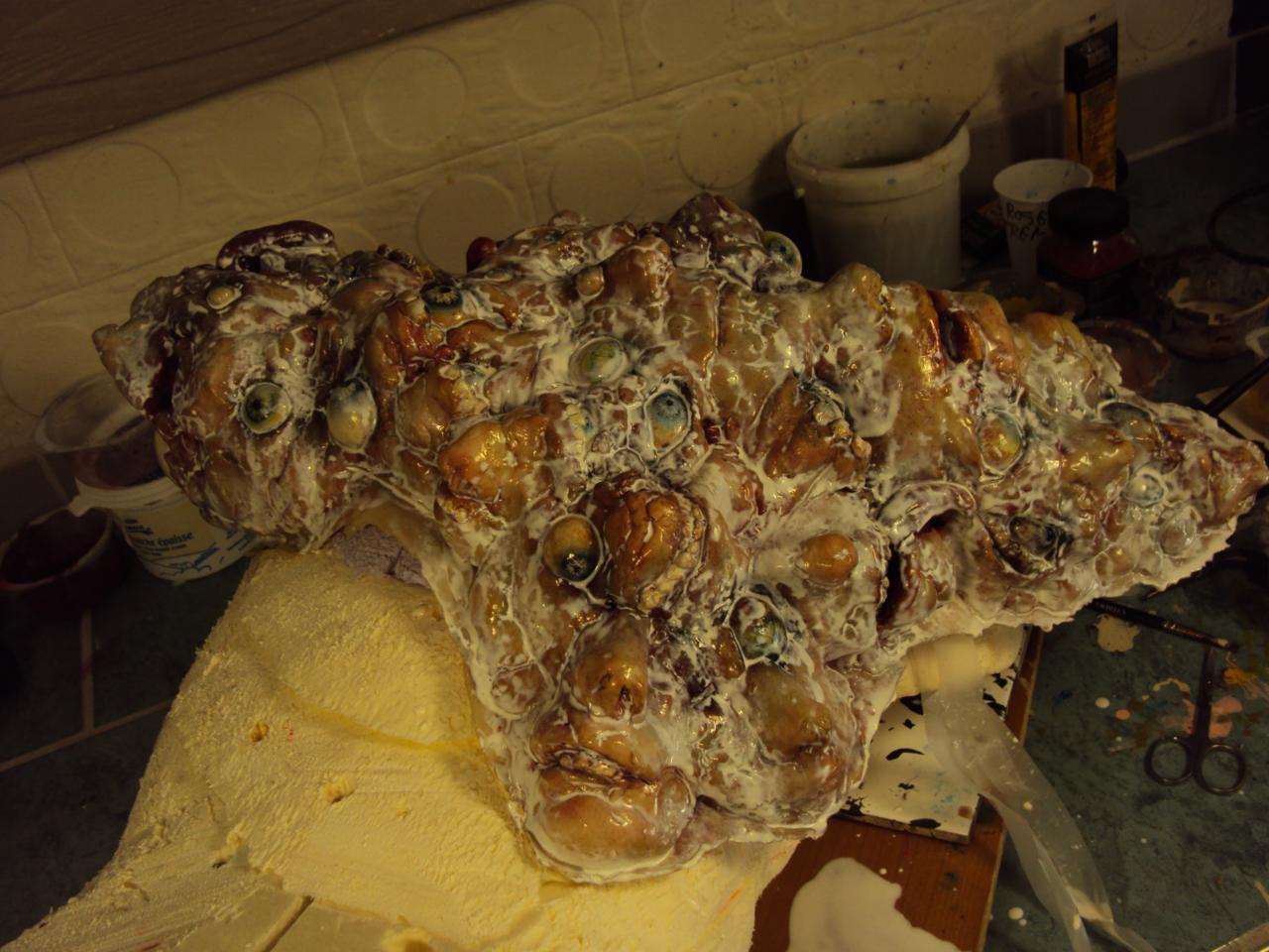 voivi un blob que je voulais faire vite fait pour la zombie walk de strasbourg (commencé 2 jour avant), je voulais torcher un truc vite fait avec ce que j'avais, j'ai donc pris plein de moules qui traine chez moi (visage et dents) j'ai écrasé de l'argile dedans j'ai posé plein de truc et ça a donné ça, j'ai même pas pris le temps de faire des textures juste lier le tout j'ai du mettre 5h a faire la "sculpture"