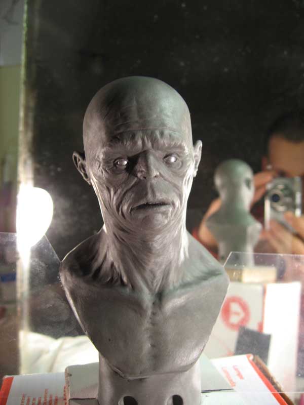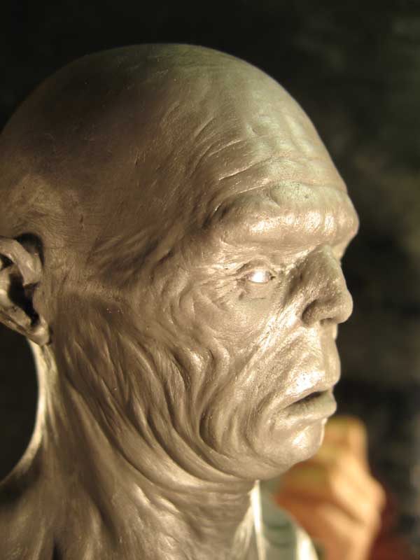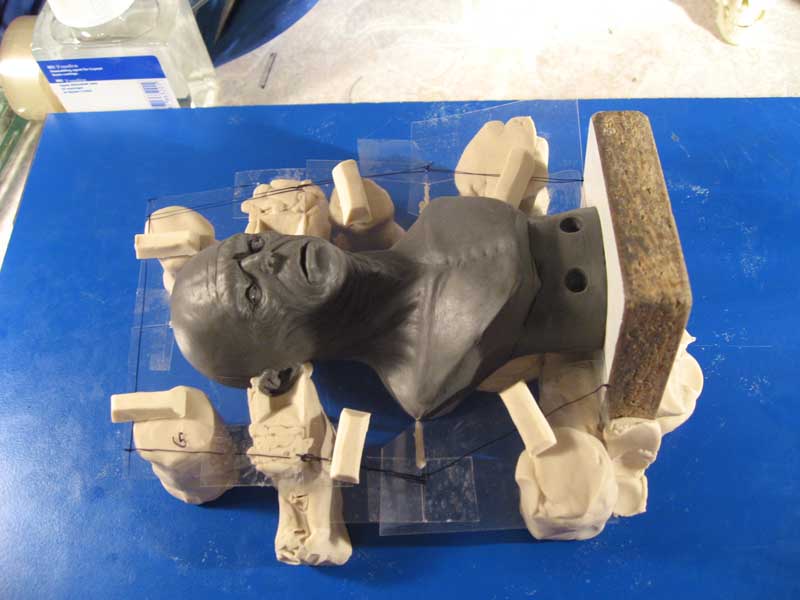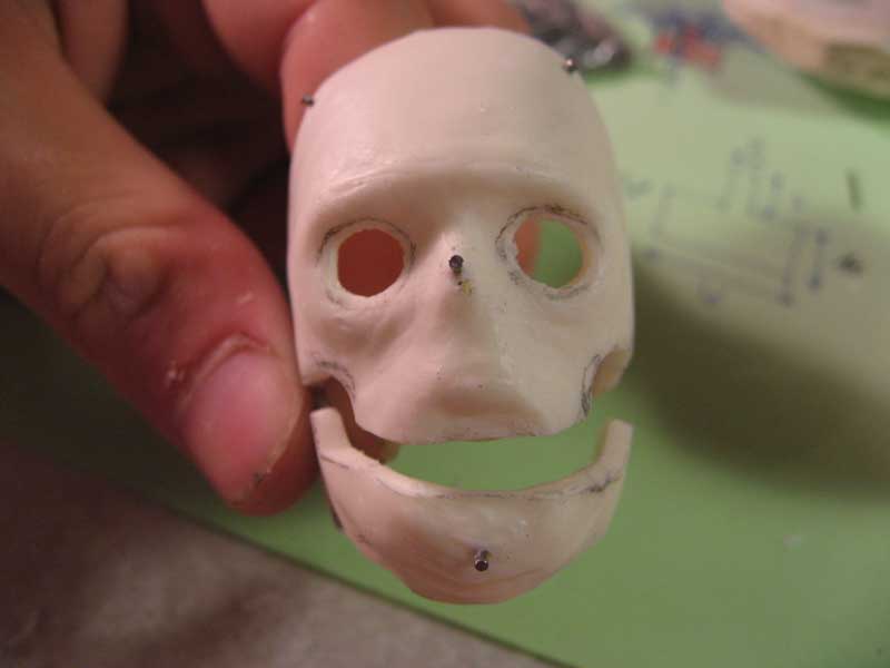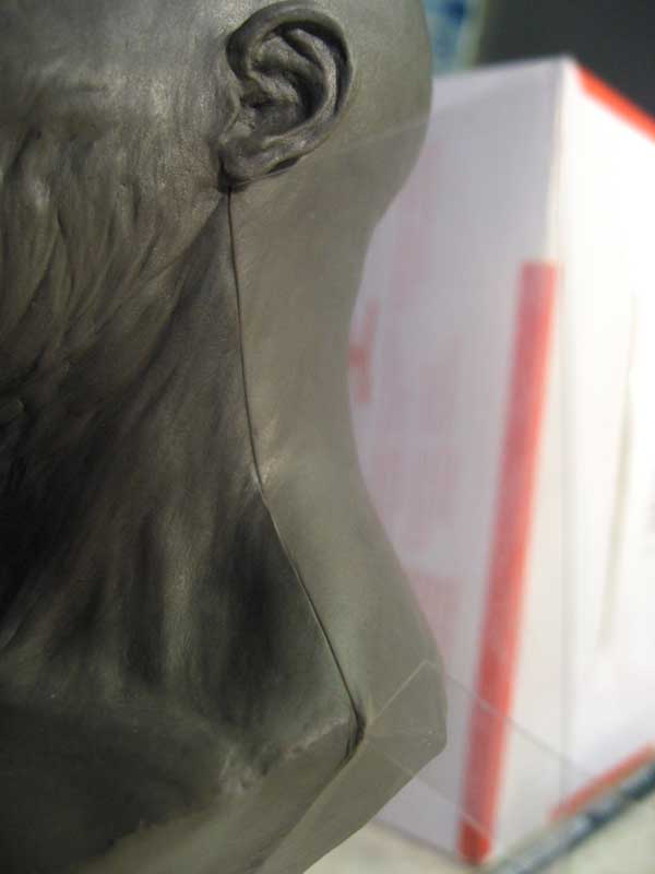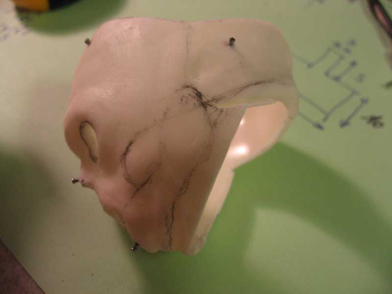 C'est important de bien repérer la forme du crâne et l'axe d'articulation de la machoire avant de découper en comparant avec la sculpture, j'avais fais un tirage test en latex qui m'a bien servi.
