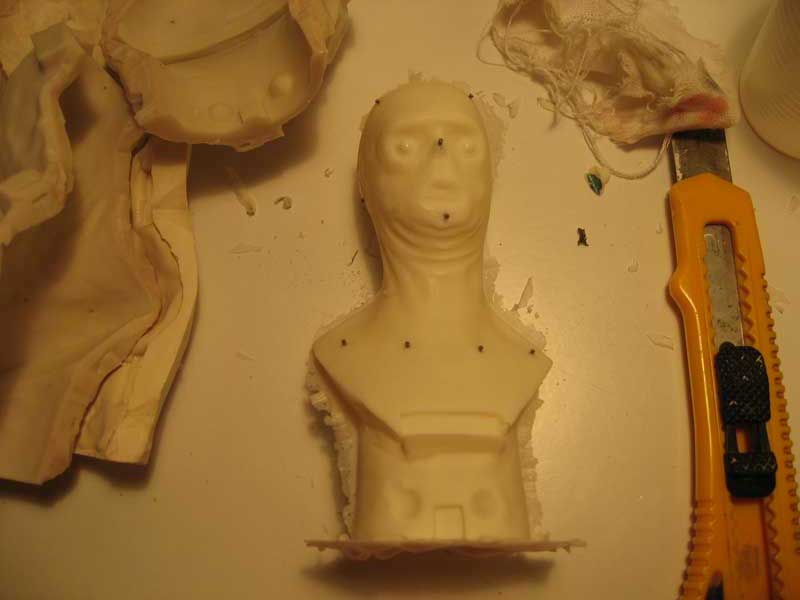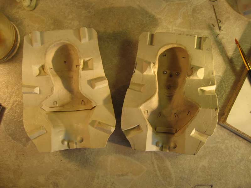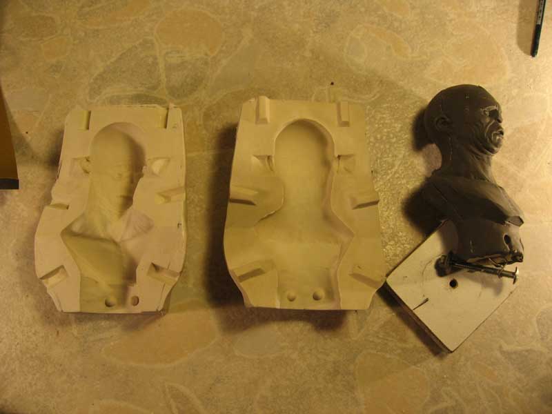 Je ne vais pas vous faire une énième explication sur la manière de faire un moule sachez seulement qu'il est en silicone estompé sous chape de plâtre. Je l'ai fait en 3 parties pour avoir un capuchon du haut du crâne et pouvoir accéder aux mécanismes dans la tête.