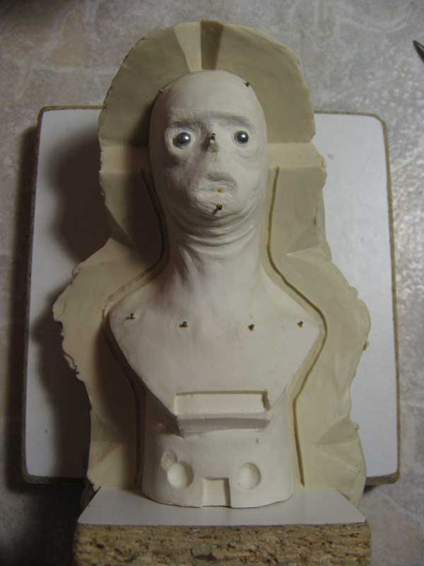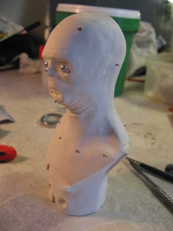 j'ai ajouté les mêmes billes que pour la sculpture (en réalité des perles de 4mm) qui seront elles aussi incrustées dans le noyau elles permettent de maitriser l'épaisseur des paupières du tirage de la peau. On voit aussi la position des crochets (nez, menton, crâne, bas du cou) j'avais prévu d'en mettre plus, mais finalement pas facile :|.