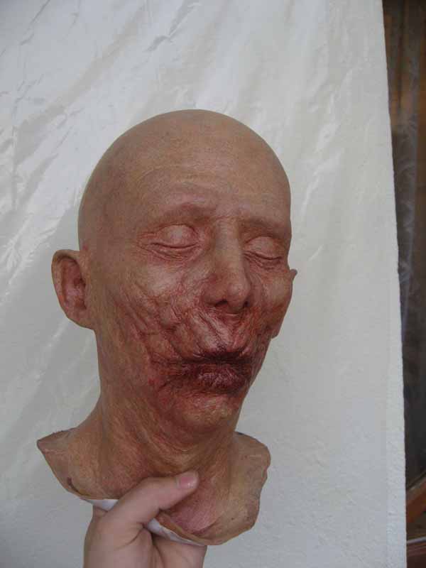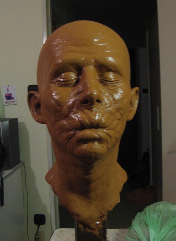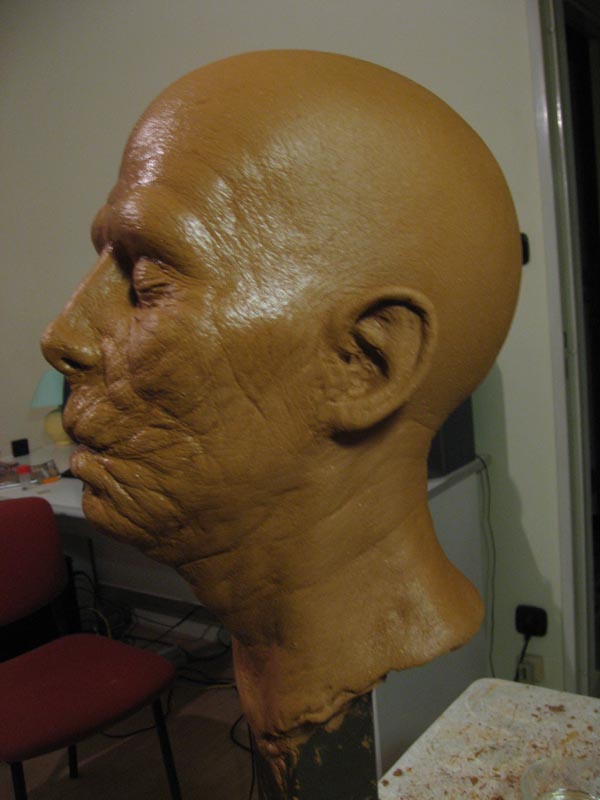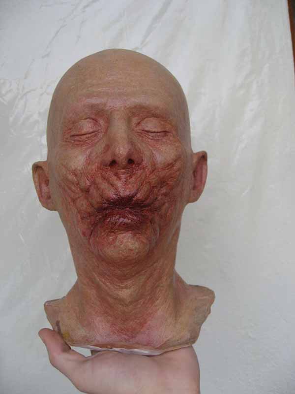 dans la pratique, pour les textures, c'est surtout fait avec une brosse à chat (je sais pas si on dit comme ça mais les anglophones disent "cat brush" il me semble) puis je lisse avec une éponge à barbe puis je reprend avec différents outils qui rayent la surface de plus en plus fin, en relissant à chaque fois, avec une éponge à barbe plus fine pour finir. Sur cette pièce, je n'ai pas utilisé de pinceau (j'aurais peut-être dû, surtout pour les oreilles) ça permet bien-sûr d'affiner encore. Pour aller encore plus loin, entre les couches tu peux revenir avec des outils fins, voir une aiguille, pour remodeler chaque pore et détail de la peau un par un (et ça c'est long, très long..), dans mon cas c'était pas le but.