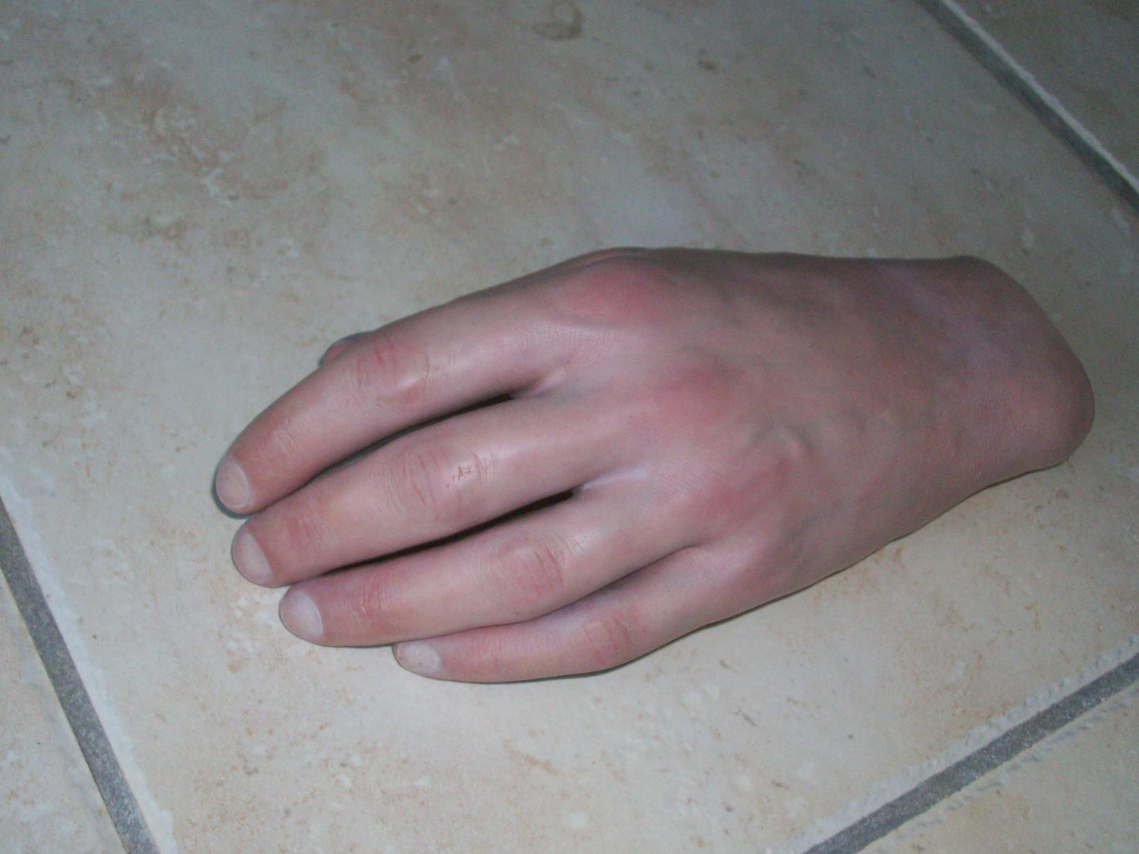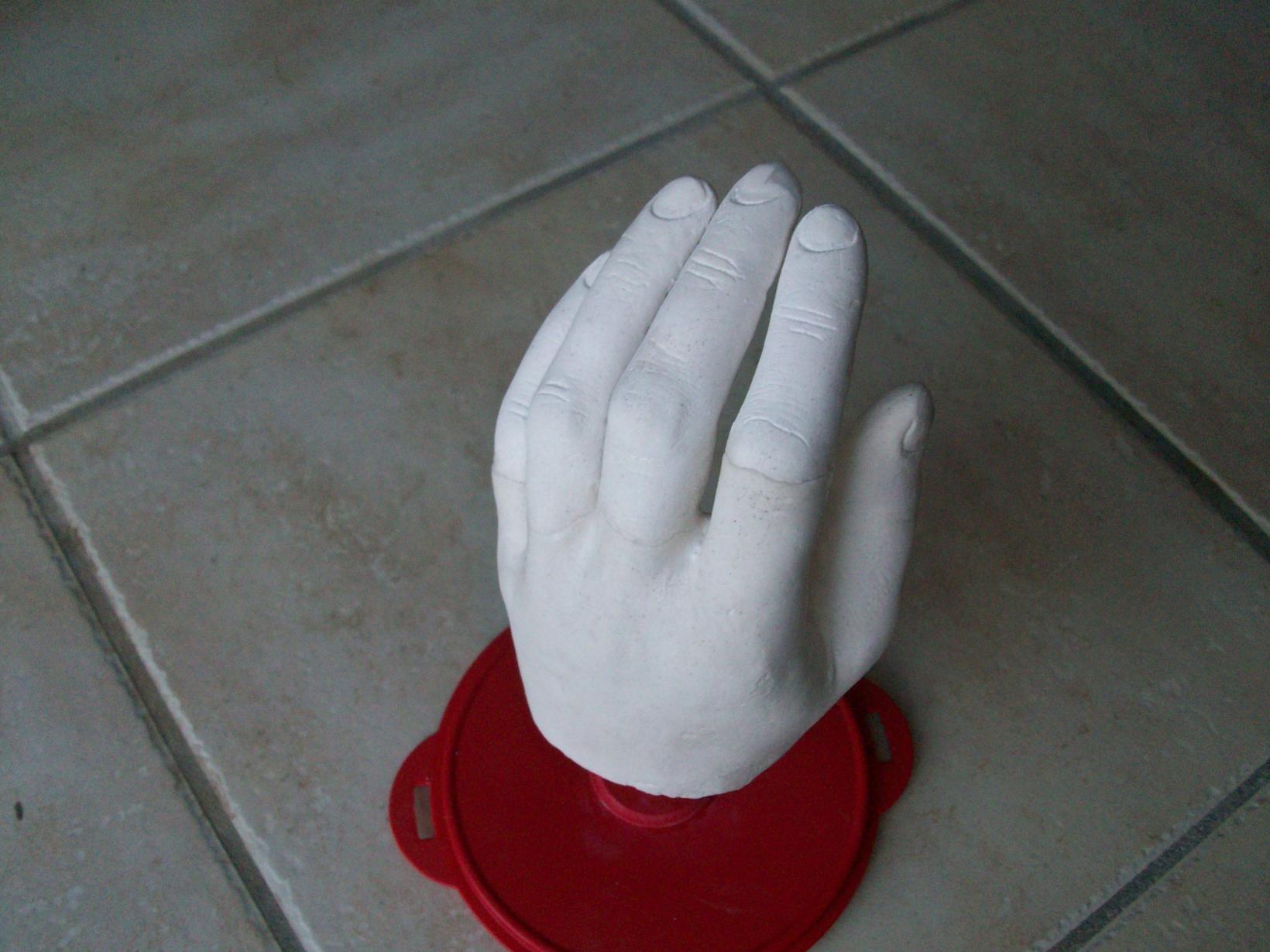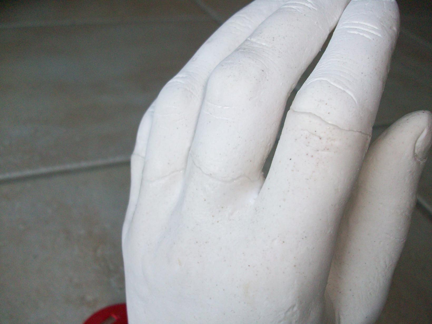 Deuxièmement, j'ai coulé du plâtre (plâtre fin de chez Cultura) dans mon moule en alginate afin de faire mon modèle, mais lors de mes deux essais, lors de l'ouverture du moule, les cinq doigts était sectionnés au niveau des premières phalanges... le 1er modèle et parti à la poubelle mais j'ai recollé (avec de la colle à bois) les doigts du 2nd modèle. La colle à bois ma aussi servi à "combler" les petites imperfection. Savez vous pourquoi à chaque fois, les doigts on cassés lors du moulage?