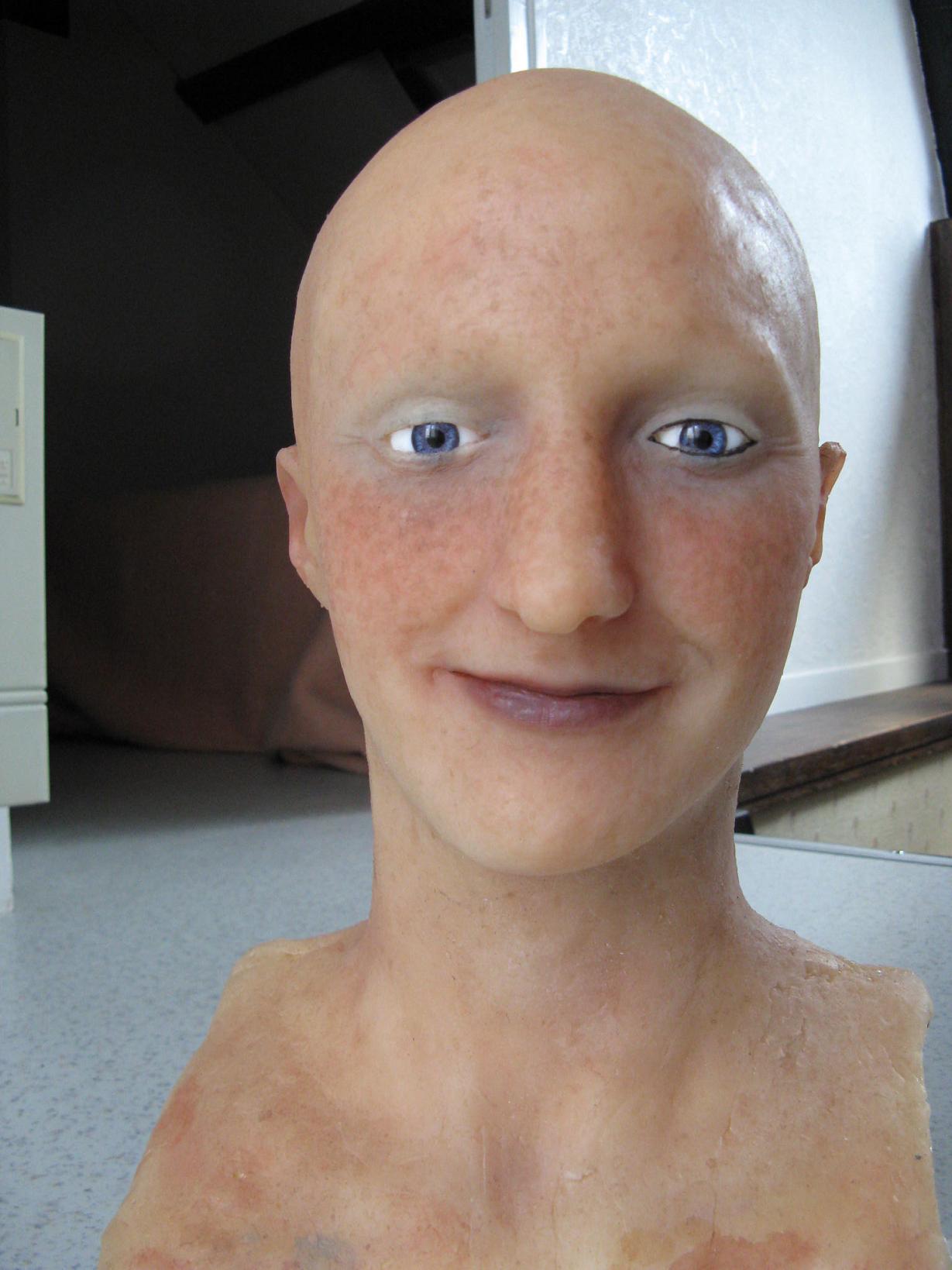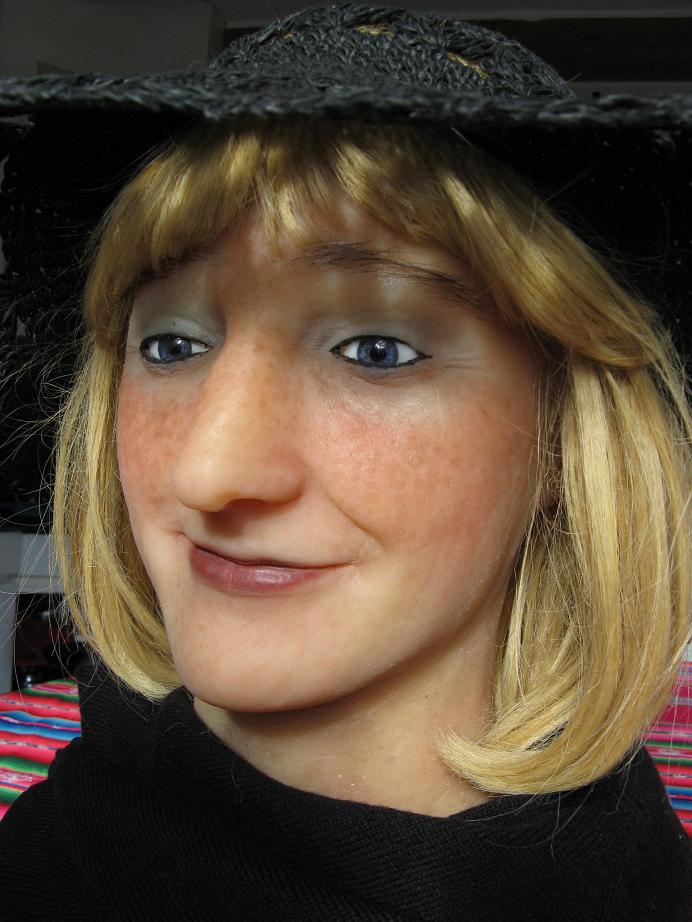 je trouve que ça fonctionne bien (par contre l'eye liner bof) . ta base est quand même trop translucide il me semble. la zone du cou à l'air moins nette mais pour la tête, j'admire les taches de rousseur, ça fait bien naturel. l'ensemble manque peut-être unpeu de bleus (à part au niveau des paupières, de la bouche,... où d'ailleurs ça à l'air de le faire). sinon je pense que tu devrais au moins essayer de lui implanter 3 poils aux sourcils et lui mettre une petite perruque (y a moyen d'en trouver des à peu près correctes à pas trop cher), histoire d'avoir une pièce finie qui va bien... voilà pour ce que j'en pense :wink: