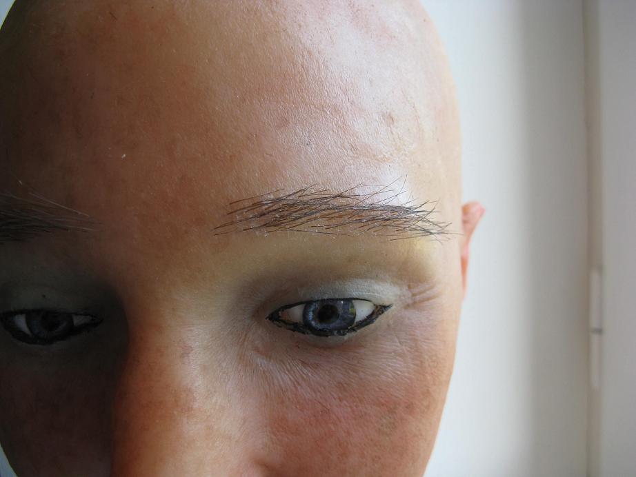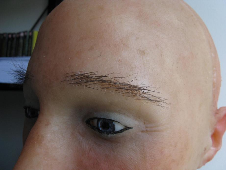 donc j'ai implanté des cheveux chatains foncés pour faire les sourcils et j'ai utilisé de la colle de bureau HUHU ( sic !) ^pour les coiffer un petit peu . ca ne tenait pas avec du gel et j'avais pas ma pros aid sous la main...