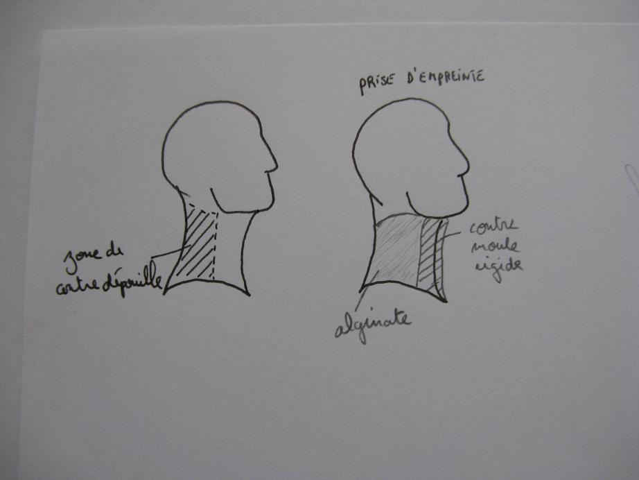 et enfin il me semble qu'il y a une technique appelée le surmoulage Qui permet de faire des protheses qui s'enroulent autour du cou de l'acteur les raccords se retrouvent en grande partie invisibles car au niveau de la nuque du modele. j'avais trouvé cette technique astucieuse (elle regle le probleme des contre depouilles) et j em'etais dit que si devais essayer je ferais de la maniere suivante......(sachant que je n'ai pas essayé et que du coup je ne sais pas si ca marche...)