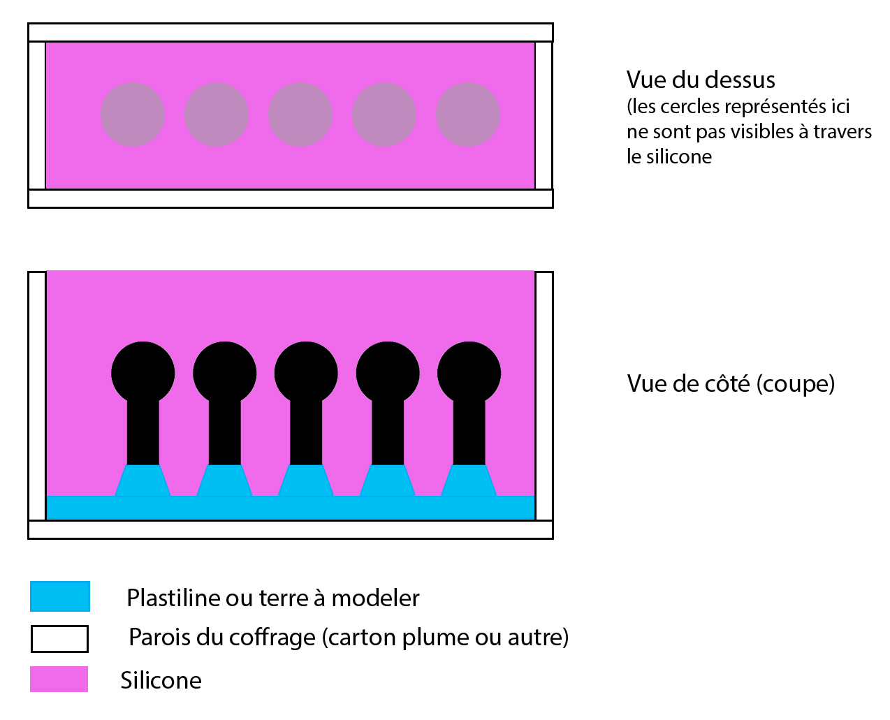 Tout dépend si tu veux une ligne sur la pièce (qui délimite les deux parties du moule) qu'il faudra ensuite poncer, ou pas de ligne du tout (ou alors presque invisible, qu'il faudra éventuellement poncer aussi, dans le cas d'un moule en une seule partie..)... Le dessin représente un moule bateau en une seule partie. Il faudra surement découper une ligne au scalpel le long de la pièce (pas tout le long, juste assez grande pour libérer/démouler la pièce)... Si tu veux faire un moule en 2 parties, le dessin vue en coupe ci dessus devient la première partie du moule, vue du dessus.. Avec la pièce à mouler et la partie conique au pied de la pièce à moitié prise dans le lit de plastiline. Tu ajoutes des 'clés de registration sur toute la surface de la plastiline - ici représentée en rose pour le silicone, mais imagine que c'est un lit de plastiline ou de terre à modeler (comme ici : http://i2.wp.com/designsojourn.com/wp-c ... =500%2C374) - des demi-sphères qui permettent plus tard aux deux demi moules de se rejoindre parfaitement. Une fois que tu as ton premier demi-moule, tu enlèves la plastiline, tu mets un démoulant, coule la deuxième membrane de silicone et voilà! http://designsojourn.com/silicone-mould ... esin-cast/ ;)