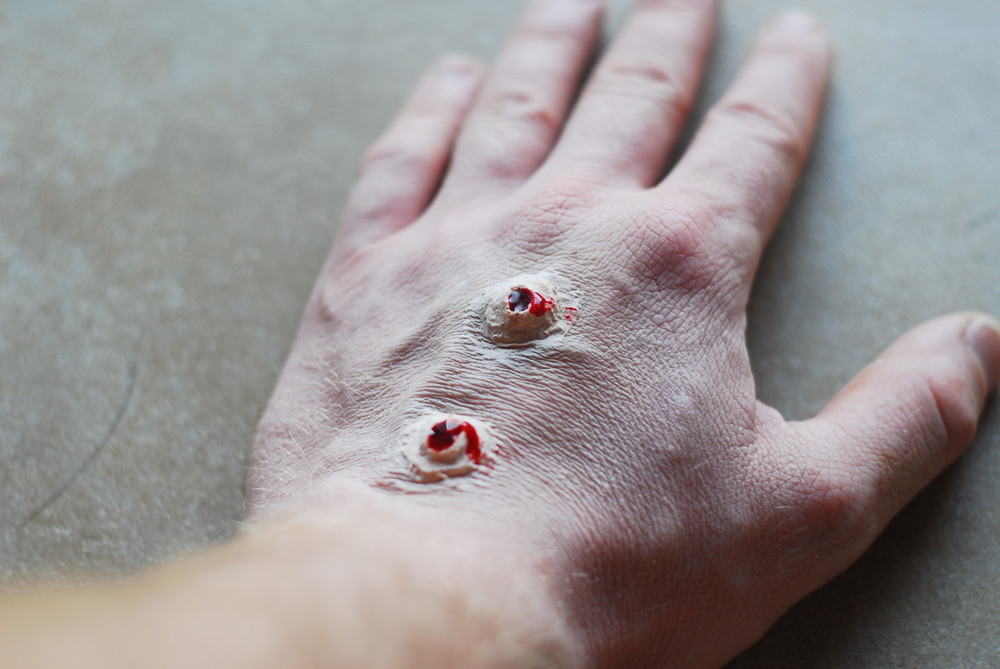 Je pense qu'au niveau du sang, tu pourrais en mettre un peu plus, genre des traces de sang qui ont bavé autour. Tu peux en rajouter autour des deux trous avec ton index ou un pinceau.