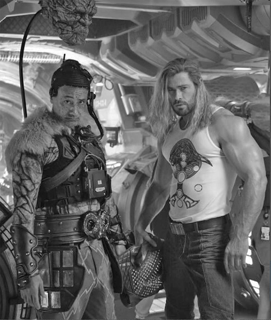 Notez la tête de Korg placée sur un support, afin que les acteurs regardent à la bonne hauteur du personnage, et non pas dans les yeux de Taika Waititi . Et face à lui, un Chris Hemsworth dont la musculature est encore plus volumineuse que d'habitude...et ce, sans effets spéciaux !