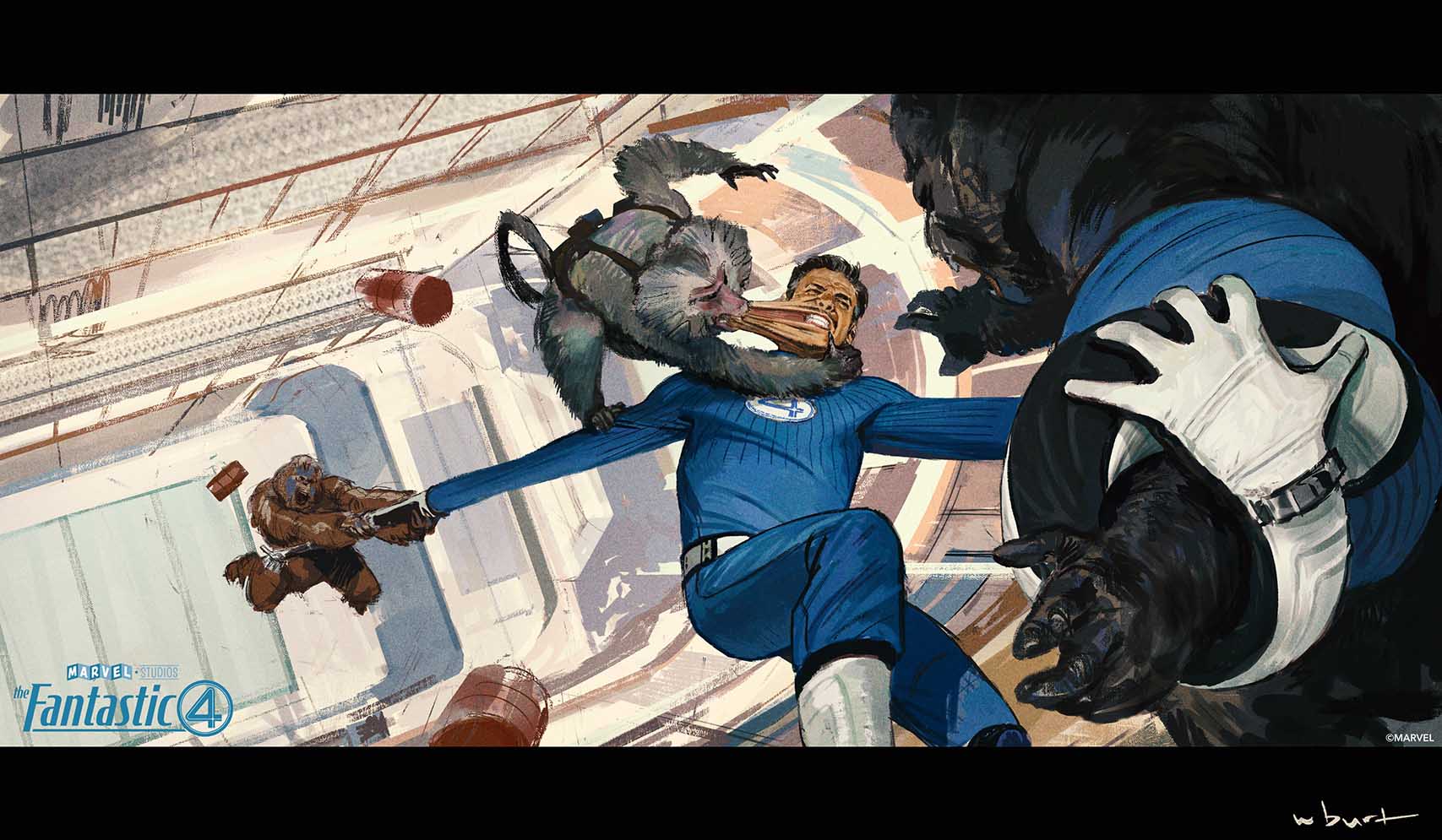 Voici l'une des illustrations préparatoires qui décrit l'affrontement entre Reed Richards et les singes du fantôme rouge : Cliquez dessus pour l'agrandir :wink: