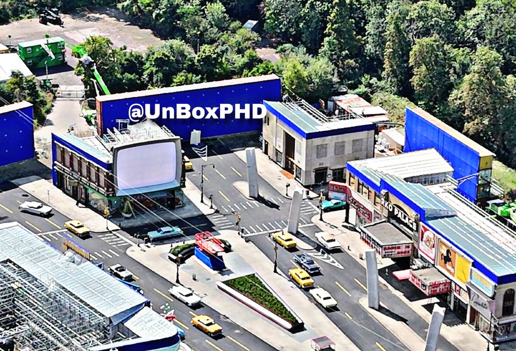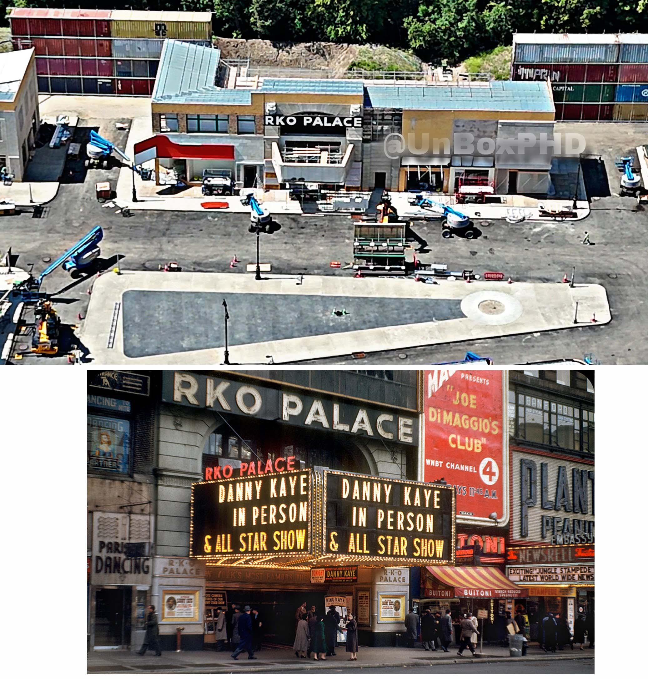 Alors autant pour moi, les nouvelles photos des décors en cours de construction, plus une petite recherche que j'ai faite pour vérifier où se trouvait la salle de cinéma RKO Palace permettent de dire désormais que le décor de ville en cours de construction n'est pas celui d'une petite bourgade, mais va représenter Time Square à New York.