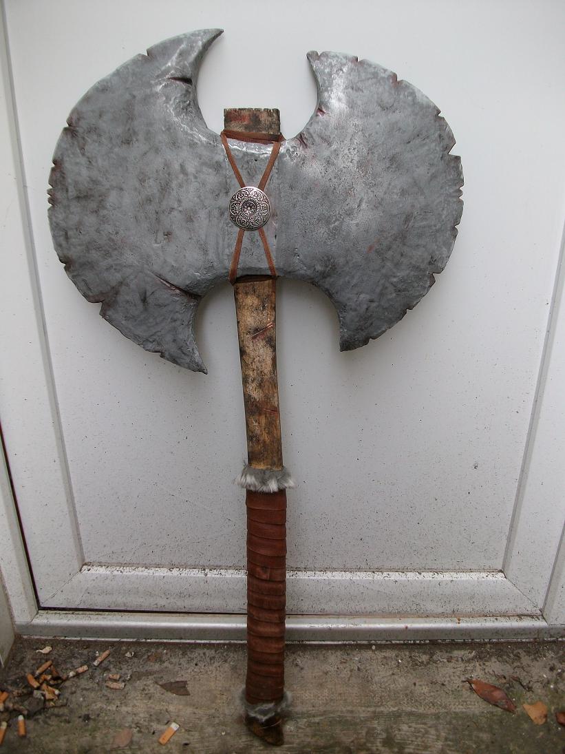 Seul truc auquel je songe seulement maintenant : si la double lame de la hache était vraiment en métal (et donc abominablement lourde), elle devrait être fixée sur un manche de bois beaucoup plus épais. Tel quel, on a l'impression que le manche est si fin qu'il va se casser au premier impact :wink: