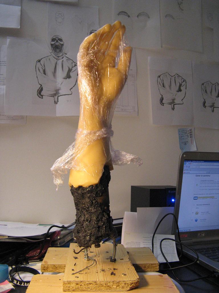 sculpture avec de la cire teintée dans la masse de matiere brulée pour faire un raccord harmonieux (le plus possible entre le bras et le moteur...)