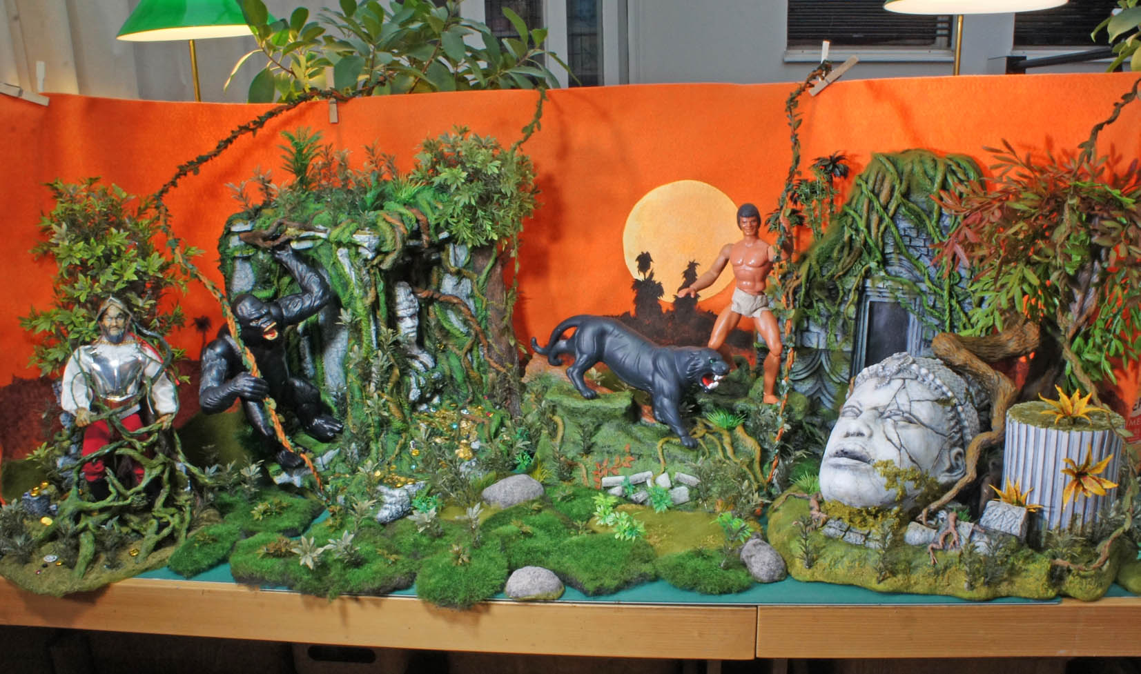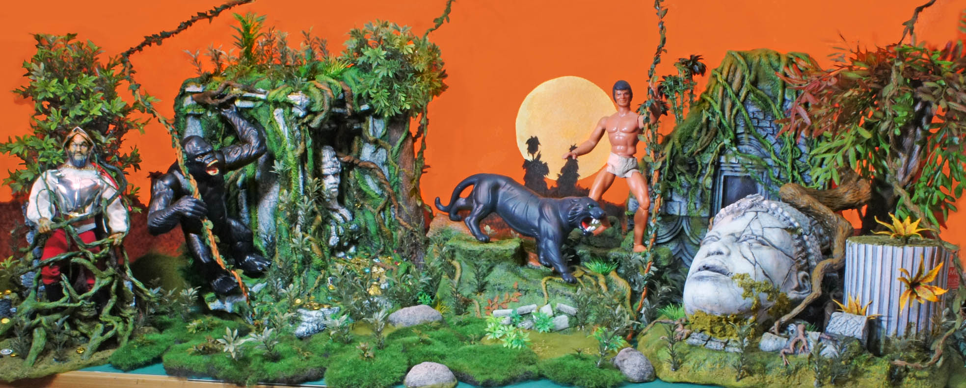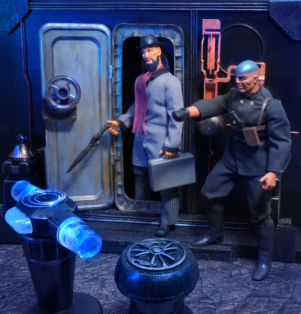 Comme j'avais eu de sérieux problèmes de santé au moment où j'achevais mon livre sur Big Jim, j'avais été contraint de renoncer à fabriquer certains dioramas que j'avais prévus après être sorti de l'hôpital, car le temps manquait pour tout finir dans les délais. C'est le thème Western qui n'a pas pu être représenté du tout par des décors miniatures, ce que je regrette, bien sûr, mais j'ai improvisé rapidement deux décors sur le thème espionnage, un en recyclant des modules de jungle, et l'autre en évoquant le laboratoire du professeur Obb, le savant fou, toujours flanqué de Boris, son chauffeur et homme de main.