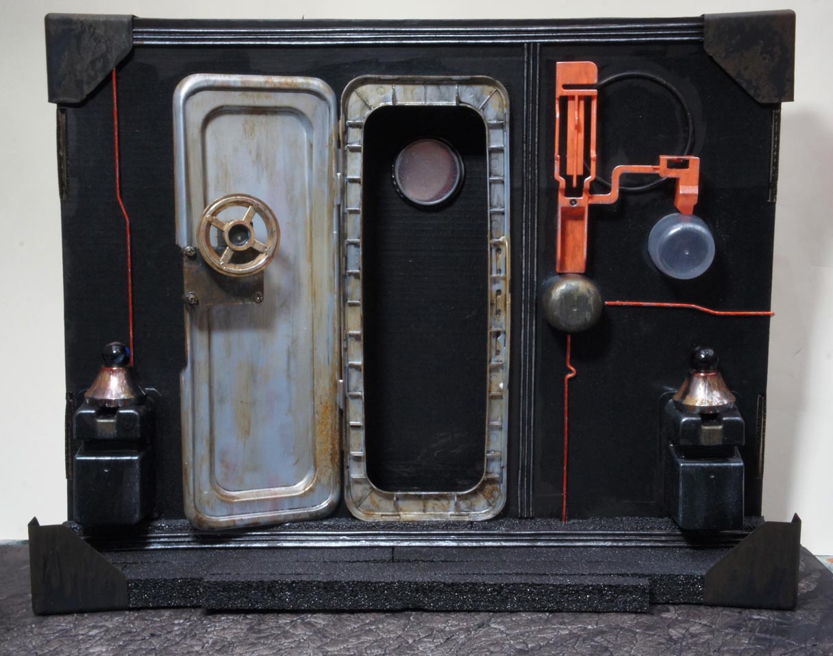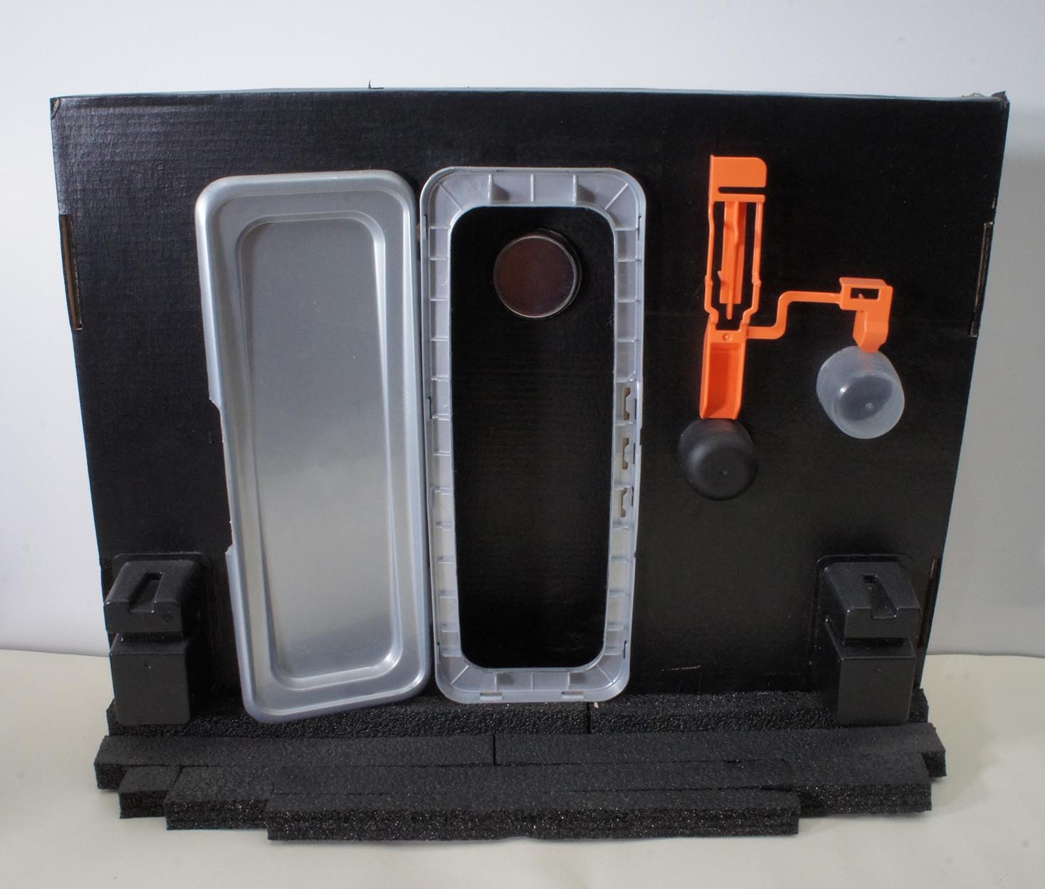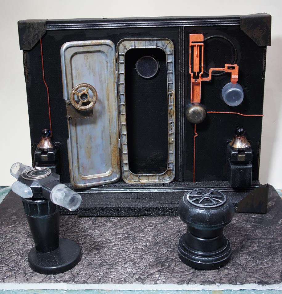 Ce mini-décor de labo a été fabriqué en quelques heures, avec ce que j'avais sous la main : une boîte de carton, des gobelets jetables, des morceaux de plastique récupérés, de couvercles de boîtes diverses. Ça a "fait la blague" en permettant de créer une petite ambiance autour des deux figurines, et comme la photo était de taille moyenne dans la mise en page, le manque de détails n'était pas trop choquant.