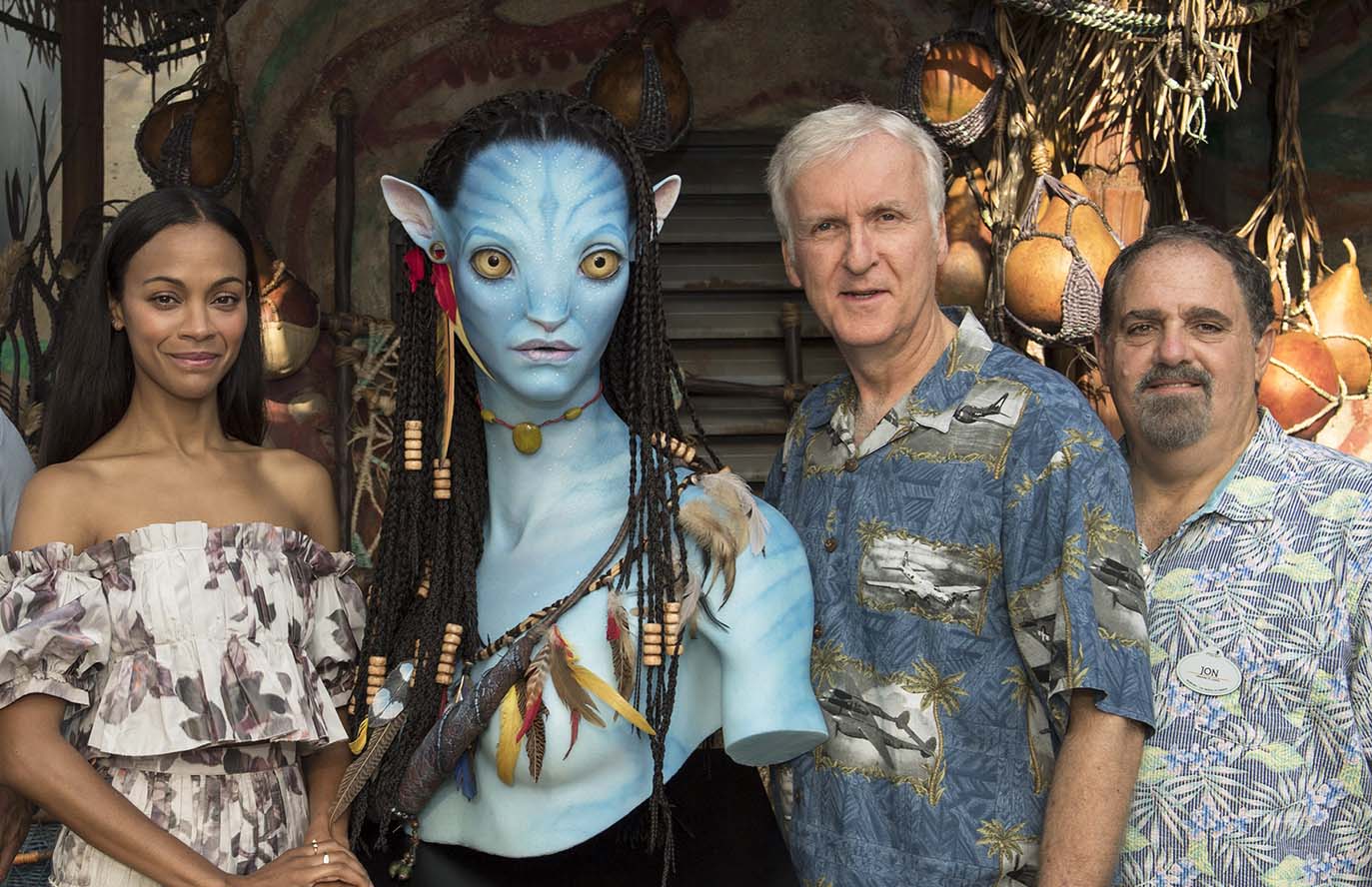 Zoe Saldana, James Cameron et Jon Landau, devant le Buste de Neytiri, a Pandora, The World of Avatar.jpg