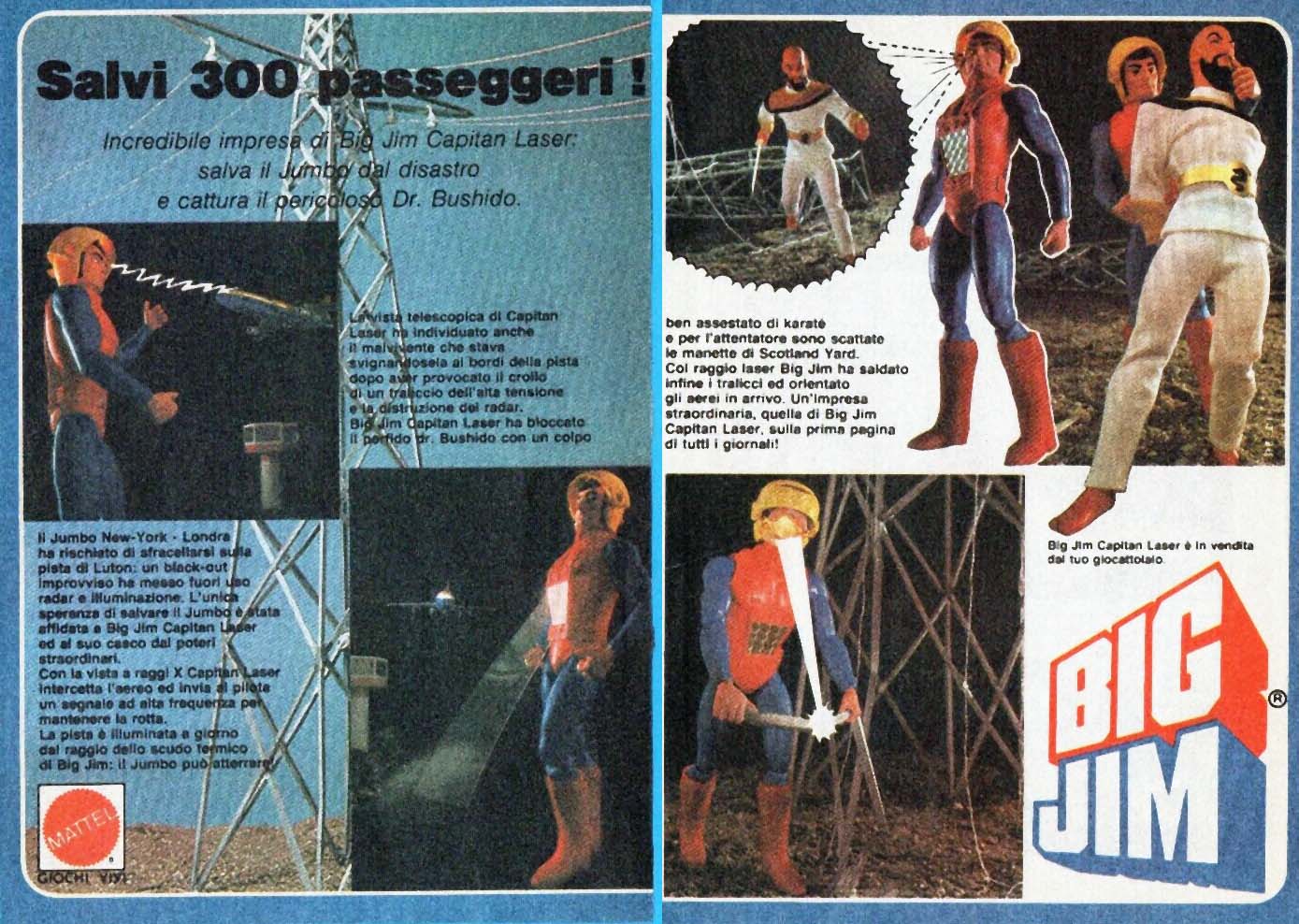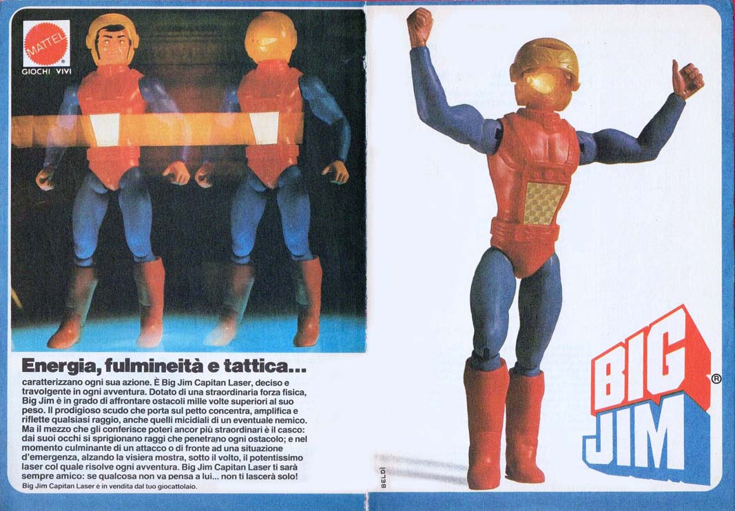 Retour en Italie avec Captain Laser ou plutôt Capitan Laser, cet étrange robot de la gamme Espionnage / Espace avec un casque et un visage qui se soulève pour révéler un faisceau lumineux. Par rapport aux autres figurines de Big Jim, il avait la particularité que ses bras souples et ses jambes soient moulés en plastique bleu, et il avait un torse et un bassin en un seul bloc pour y loger les piles.