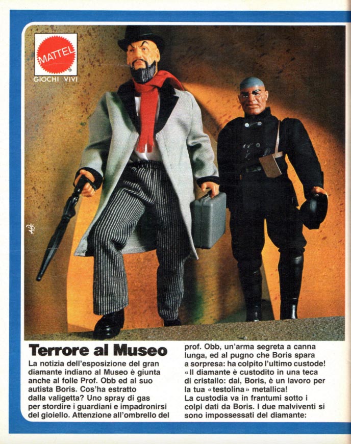 Le professeur Obb et Boris sont "à l'honneur" aujourd'hui, dans cette pub italienne en deux pages qui crée une ambiance mystérieuse de vol dans un Musée avec des décors habilement suggérés, parfaitement éclairés et cadrés pour donner l'impression de voir un escalier et un couloir en sous-sol, juste grâce à quelques feuilles de carton ! Un très joli travail du photographe, vraiment.