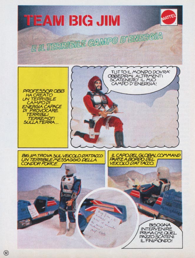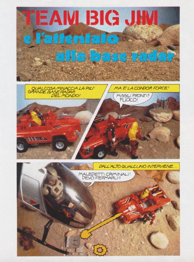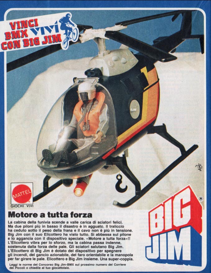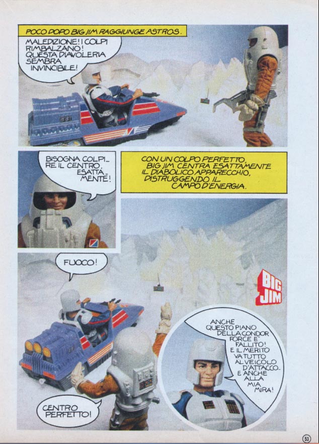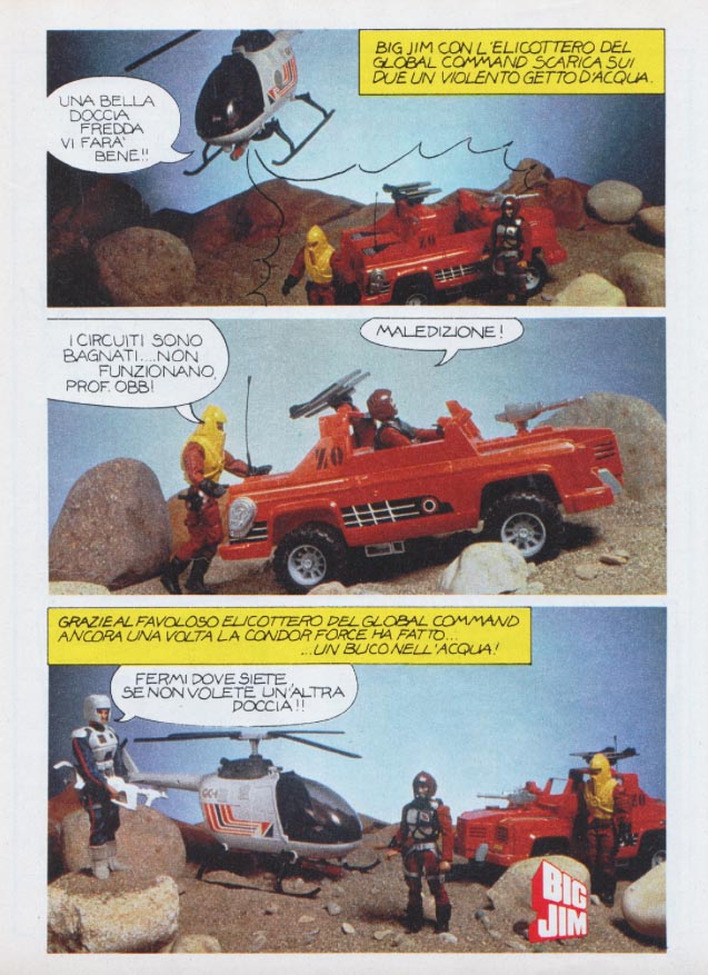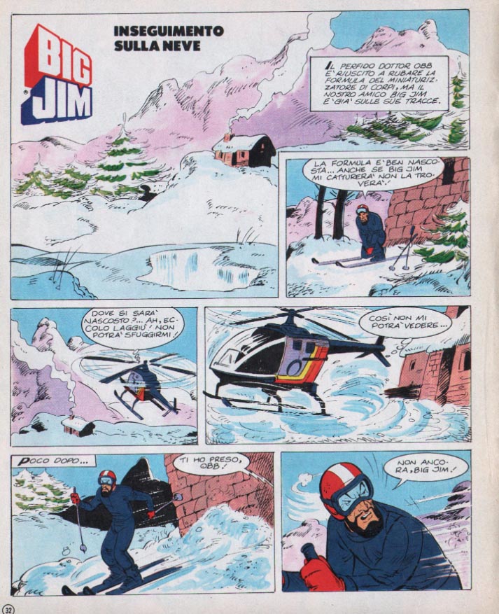 C'est l'hélicoptère de la gamme spy qui est mis en avant dans cette pub et cette aventure en BD qui se déroulent toutes les deux en haute montagne. On y apprend au début que le perfide Professeur Obb s'est installé dans un refuge pour mettre au point "une formule qui permet de rapetisser le corps humain". A la taille d'un Big Jim peut-être ? :wink: :lol: