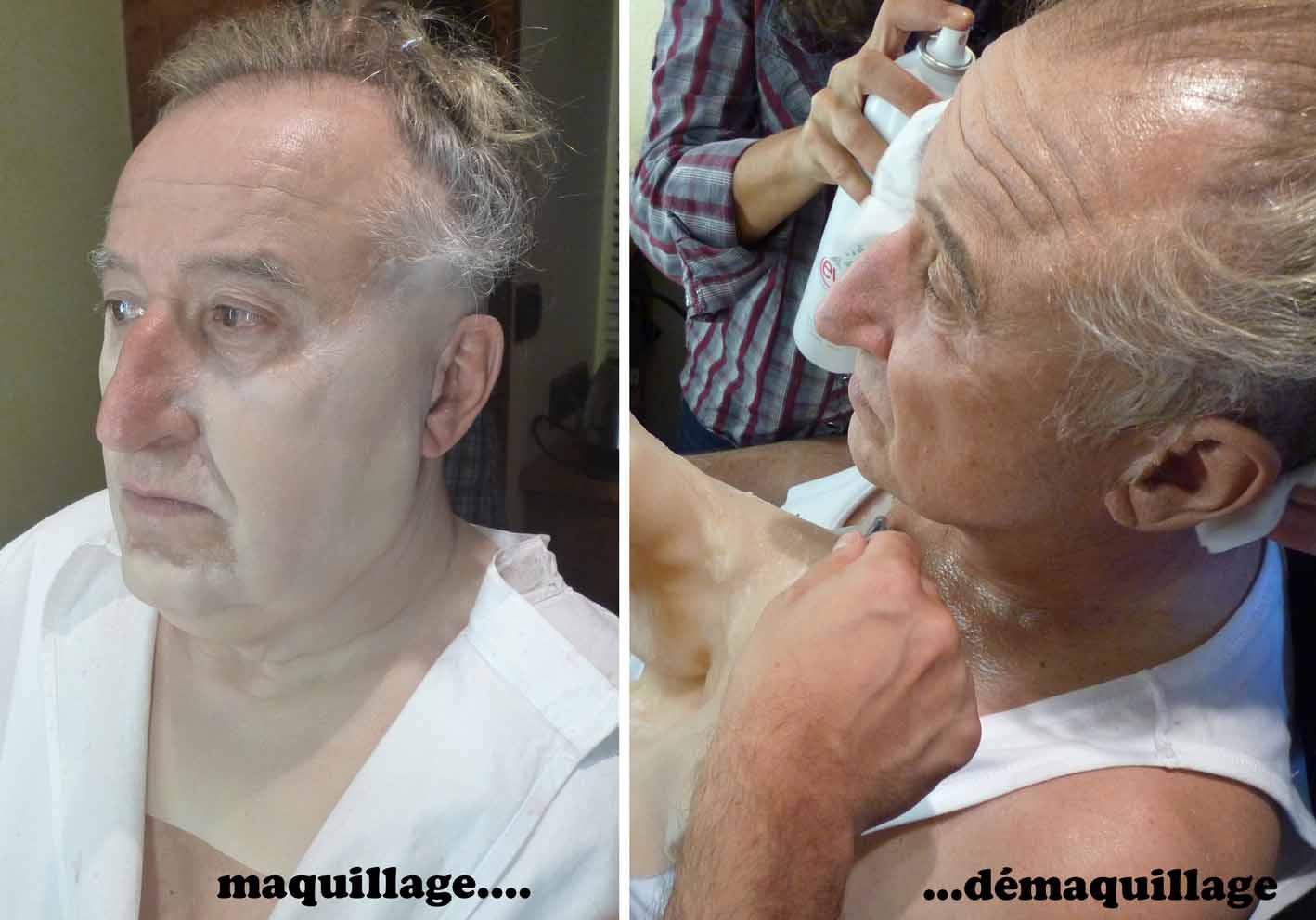 Bien sûr nous étions dans l'économie d'un téléfilm, avec des gros plans tournés en fin de journée etc... donc je suis certain que certaines scènes me feront un peu grincer des dents. Cela dit il est quand même très rare, en France, de voir le comédien principal recouvert de prothèse (17 jours de tournage, 5h de maquillage) avec un sujet aussi sérieux. En tout cas on a fait notre maximum et je suis fier de notre travail, dont voici quelques photos :D
