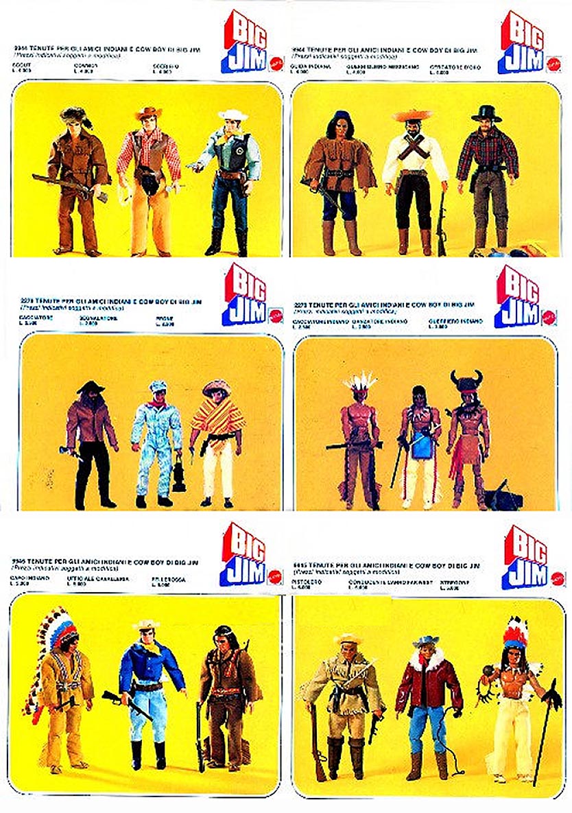 Best of des panoplies des années 70 dans les catalogues italiens, plus un visuel de présentoir de magasin de jouets tiré d'un catalogue allemand qui fera saliver les collectionneurs de Big Jim :D