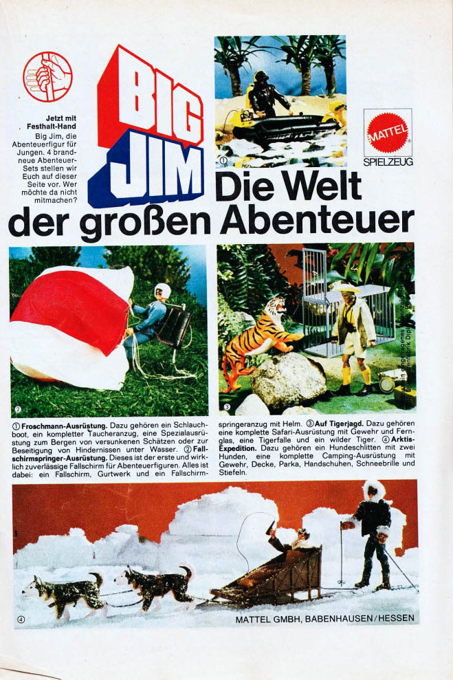 Aujourd'hui, deux pubs allemandes et une française qui décrivent Big Jim et ses amis comme des héros de l'Aventure avec un grand A !
