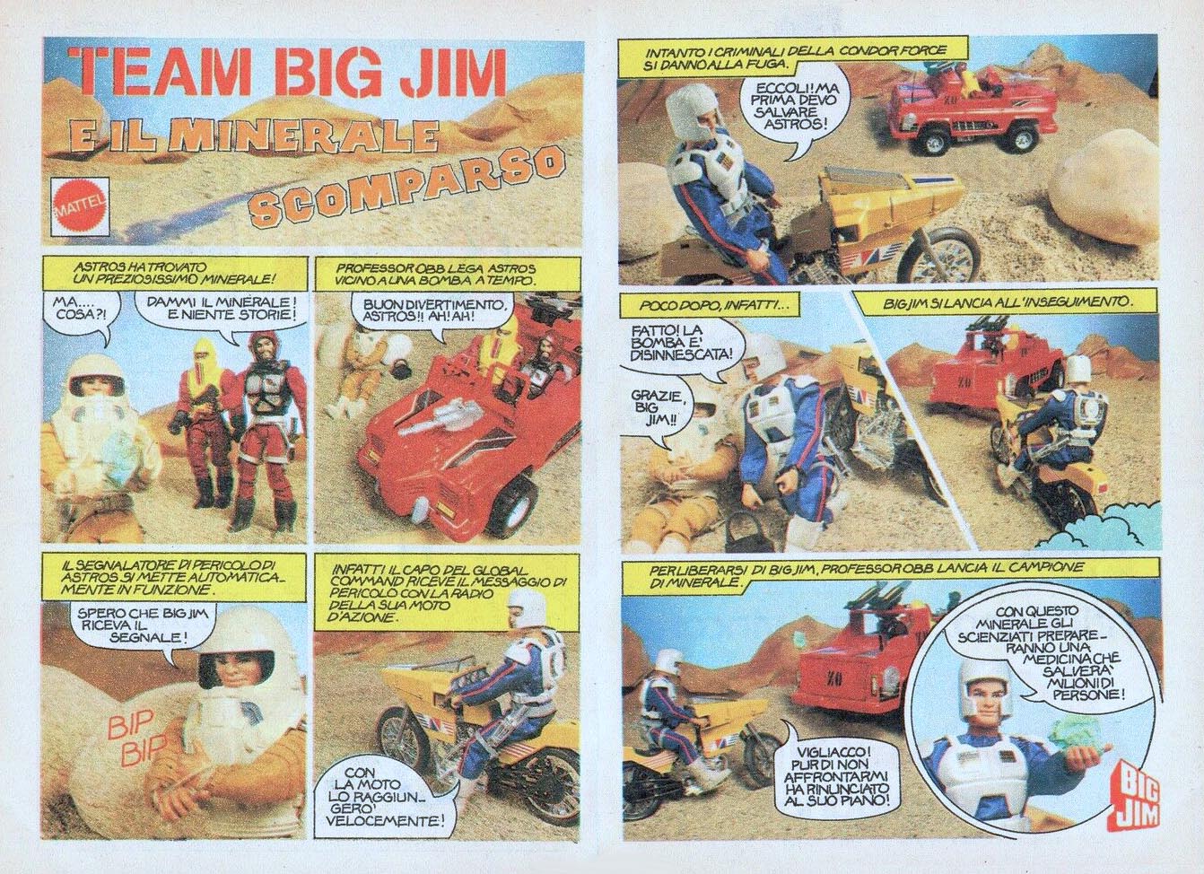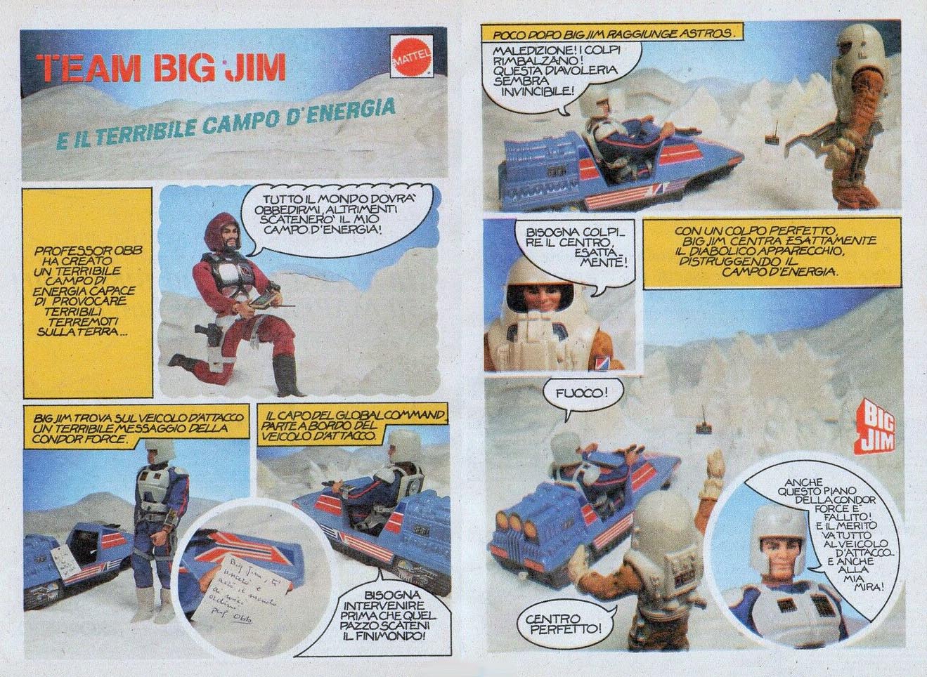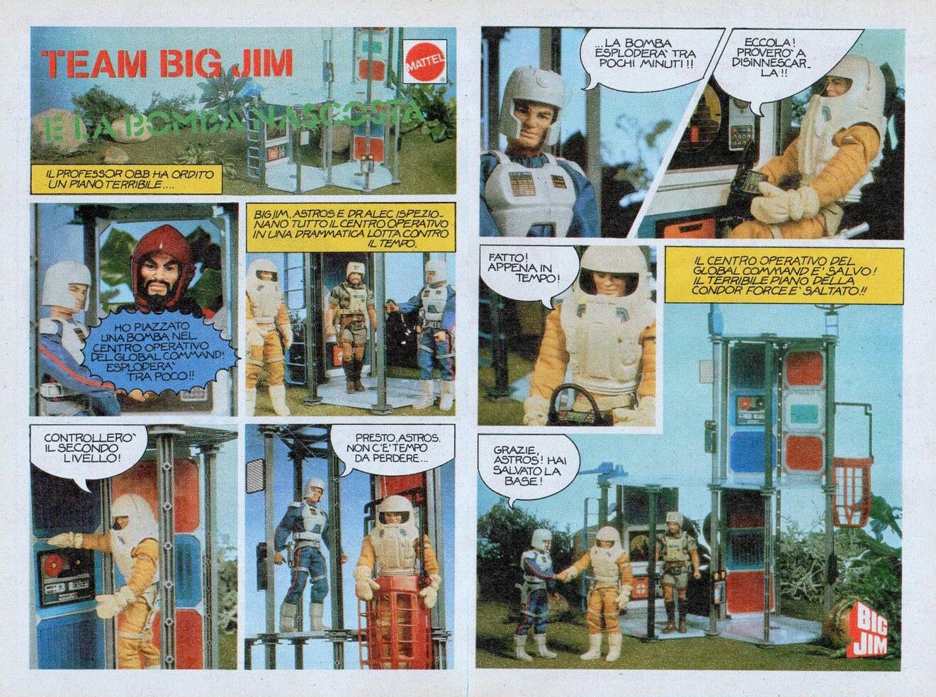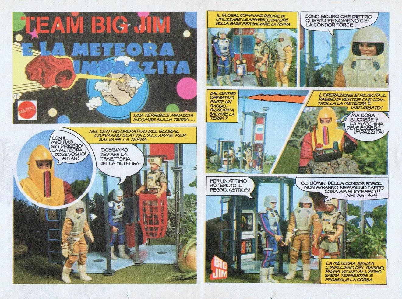 Retour dans le futur, en ce début de week-end, avec les pubs italiennes consacrées à la gamme espionnage / espace de Big Jim ! Voici un roman-photo de deux pages qui se déroule dans la base spatiale de l'organisation des héros, Global Command, et qui montre les équipements grâce auxquels le météore envoyé par les méchants de la Force Condor pour frapper la terre, va pouvoir être repoussé !