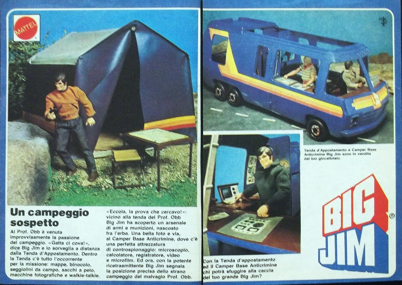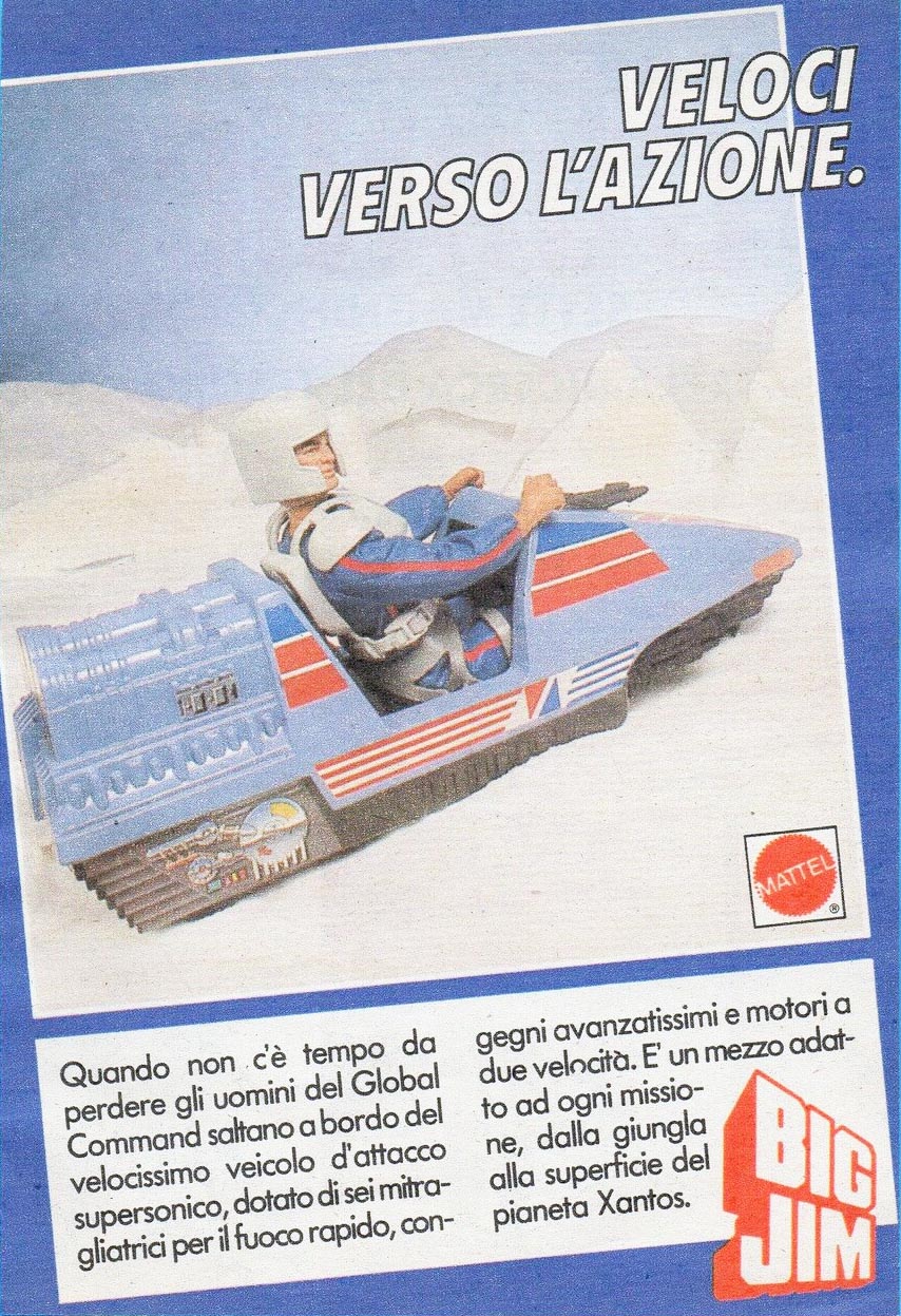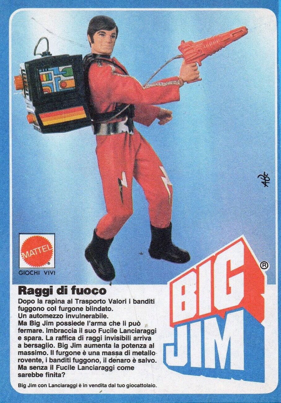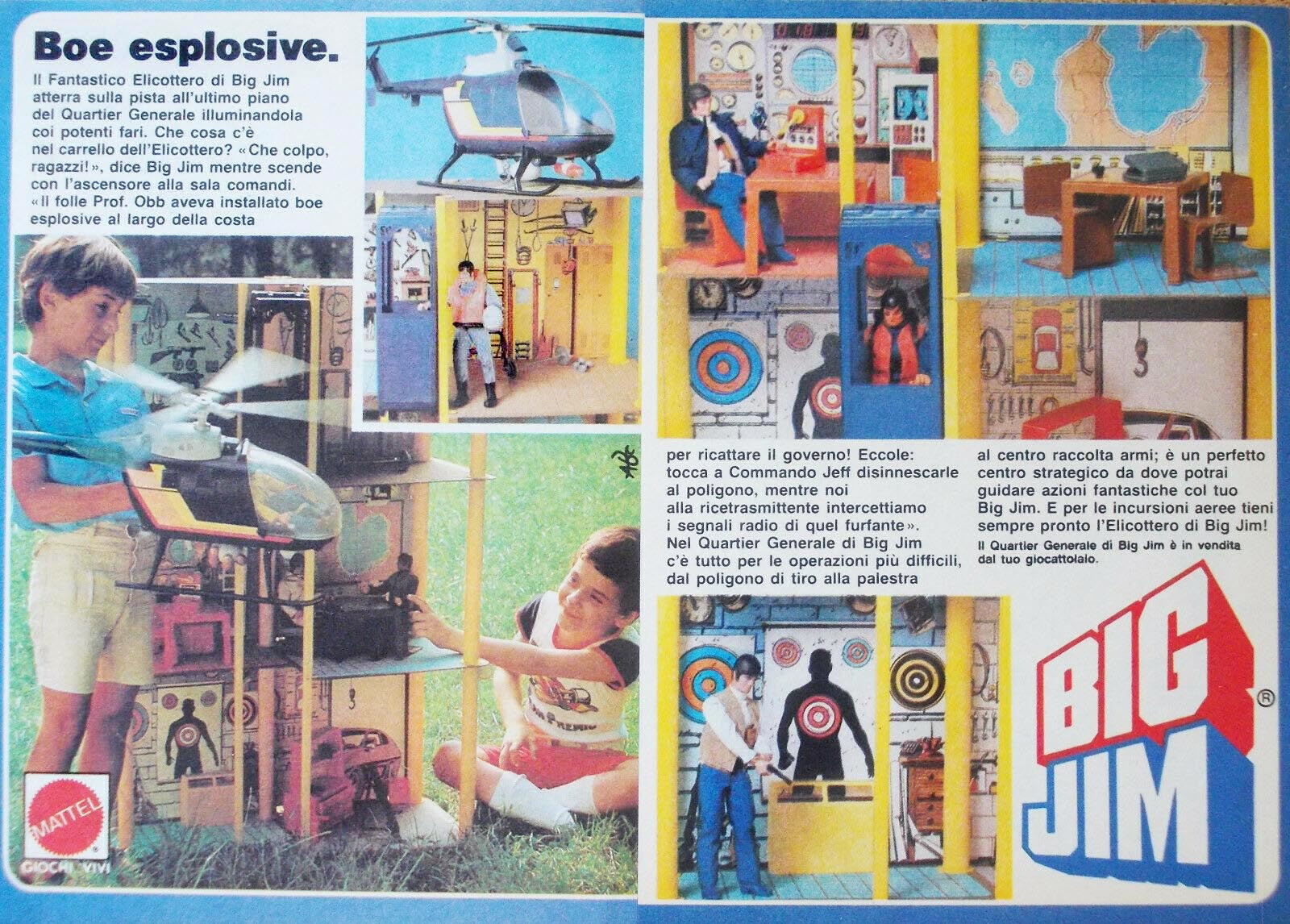 Retour dans le futur, en ce début de week-end, avec les pubs italiennes consacrées à la gamme espionnage / espace de Big Jim ! Voici un roman-photo de deux pages qui se déroule dans la base spatiale de l'organisation des héros, Global Command, et qui montre les équipements grâce auxquels le météore envoyé par les méchants de la Force Condor pour frapper la terre, va pouvoir être repoussé !