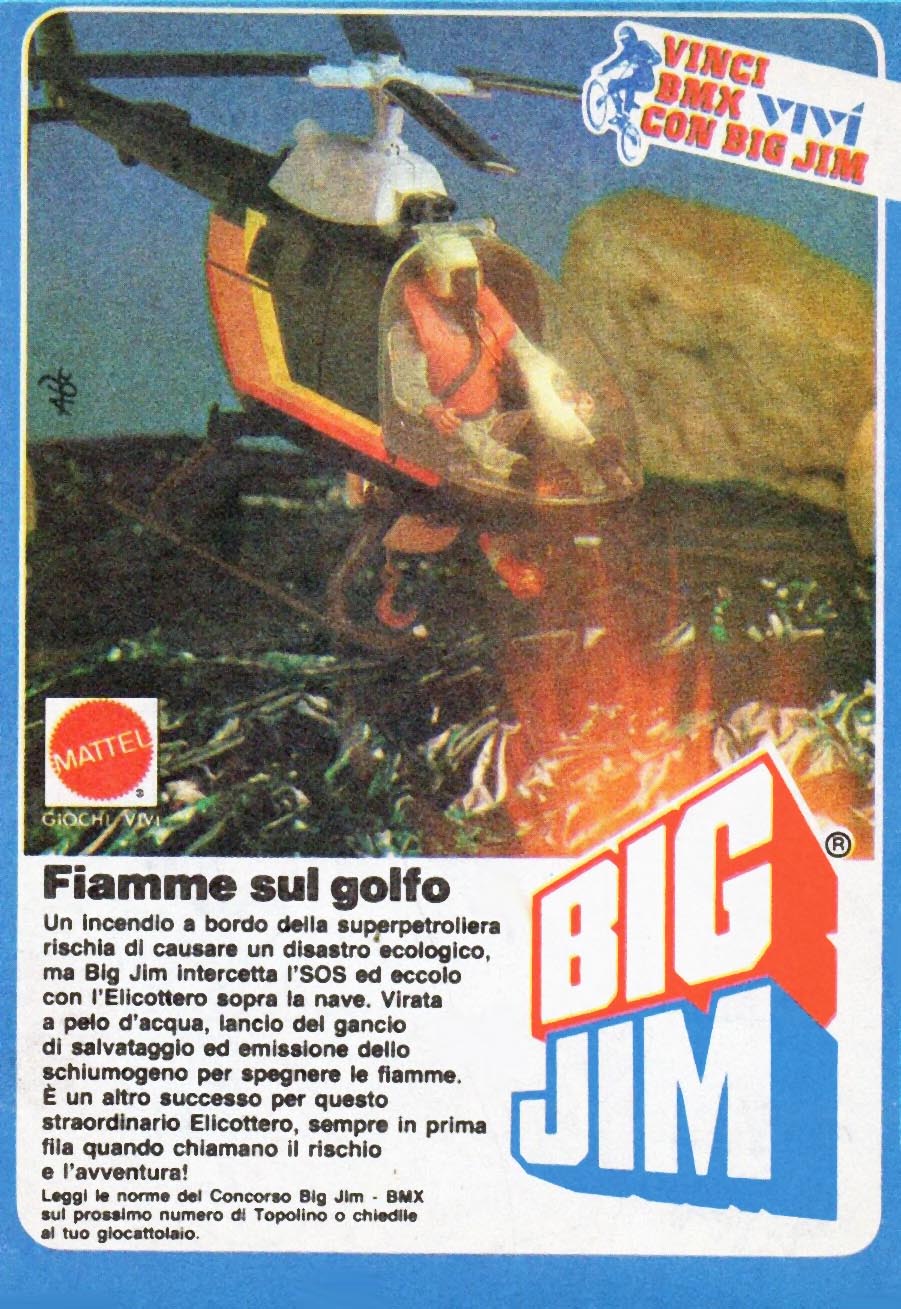 Ne vous étonnez pas du drôle d'aspect de la mer dans la pub pour l'hélico : Big Jim survole une marée noire et tente d'éteindre le pétrole en feu ! Il a de rudes journées, quand même...